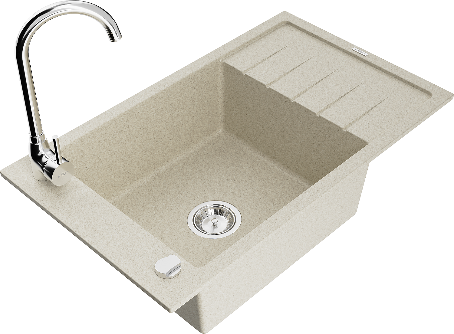 Mexen Elias vienos kameros granito kriauklė su nusausintuvu ir virtuviniu maišytuvu Telma, smėlio spalvos - 6511-69-670200-00