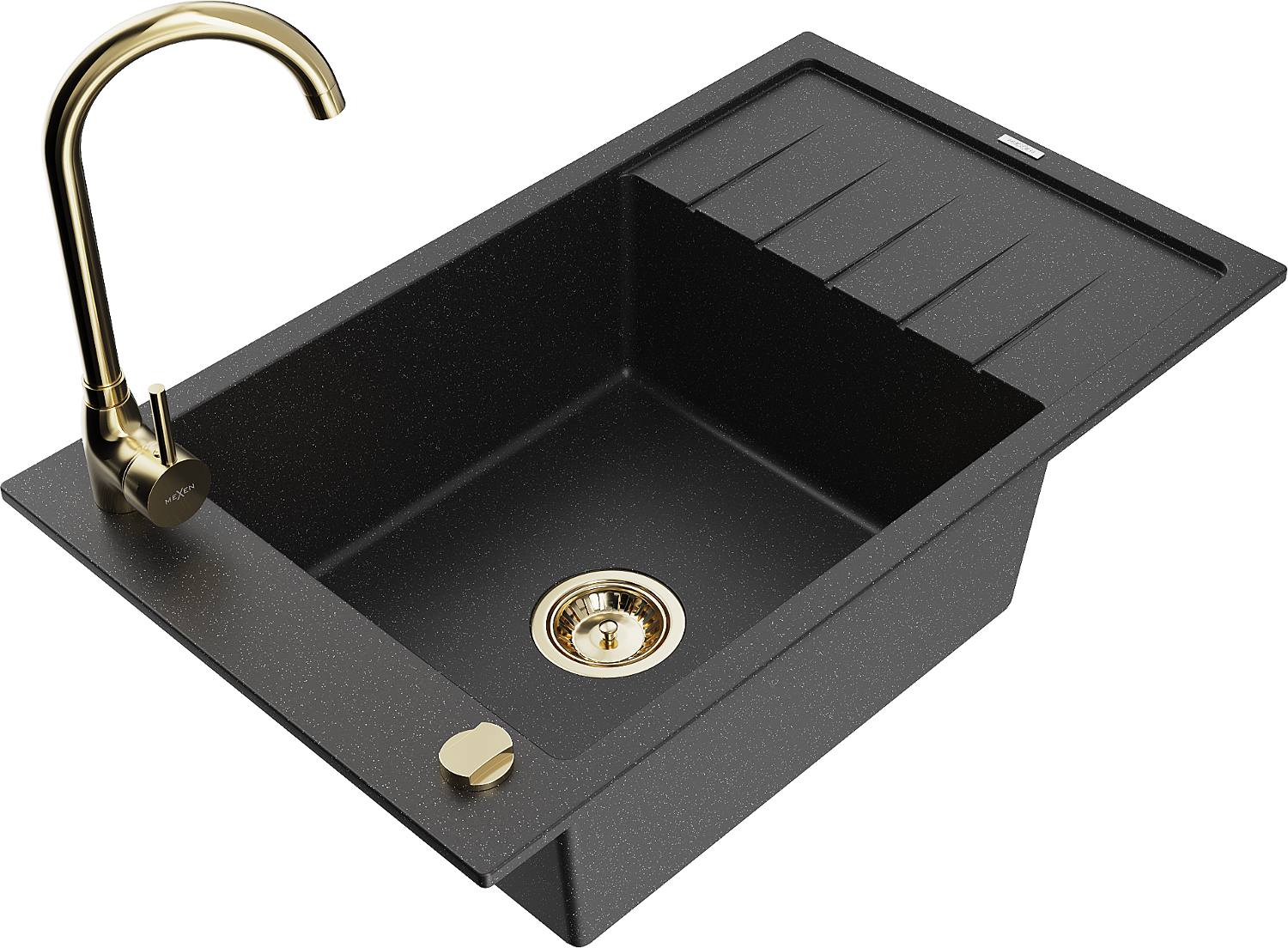 Mexen Elias 1 kamerų granitinė plautuvė su nusausinimo paviršiumi ir Telma virtuvės maišytuvu, juoda/sidabrinė