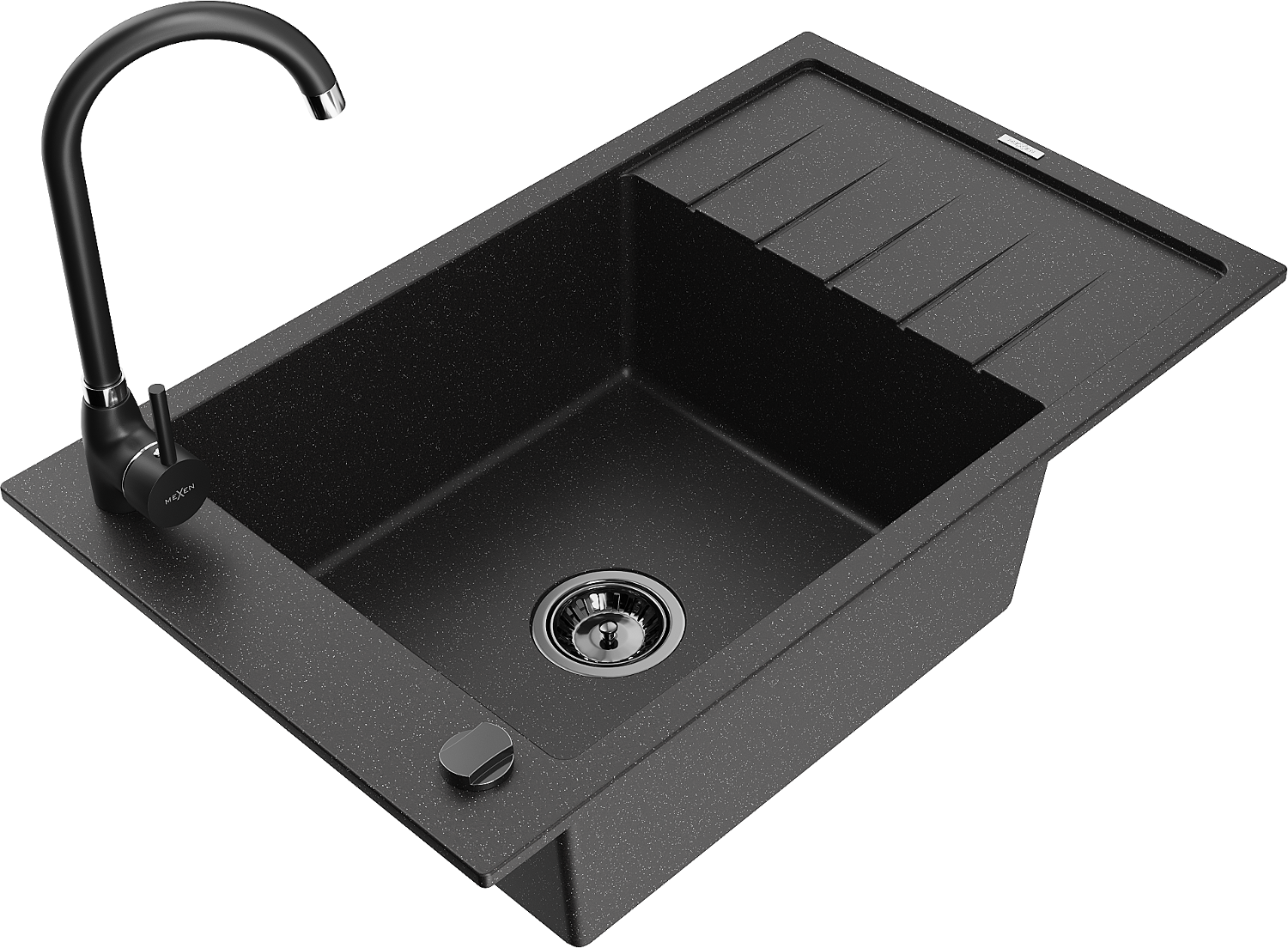 Mexen Elias granitinė vieno dubens plautuvė su nutekamuoju paviršiumi ir virtuviniu maišytuvu Telma, juoda/sidabrinė