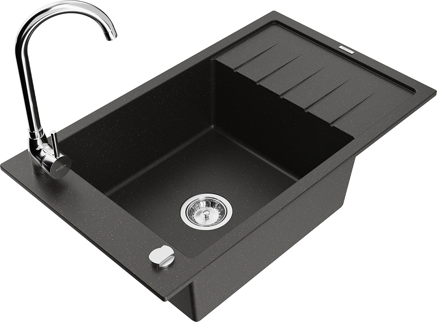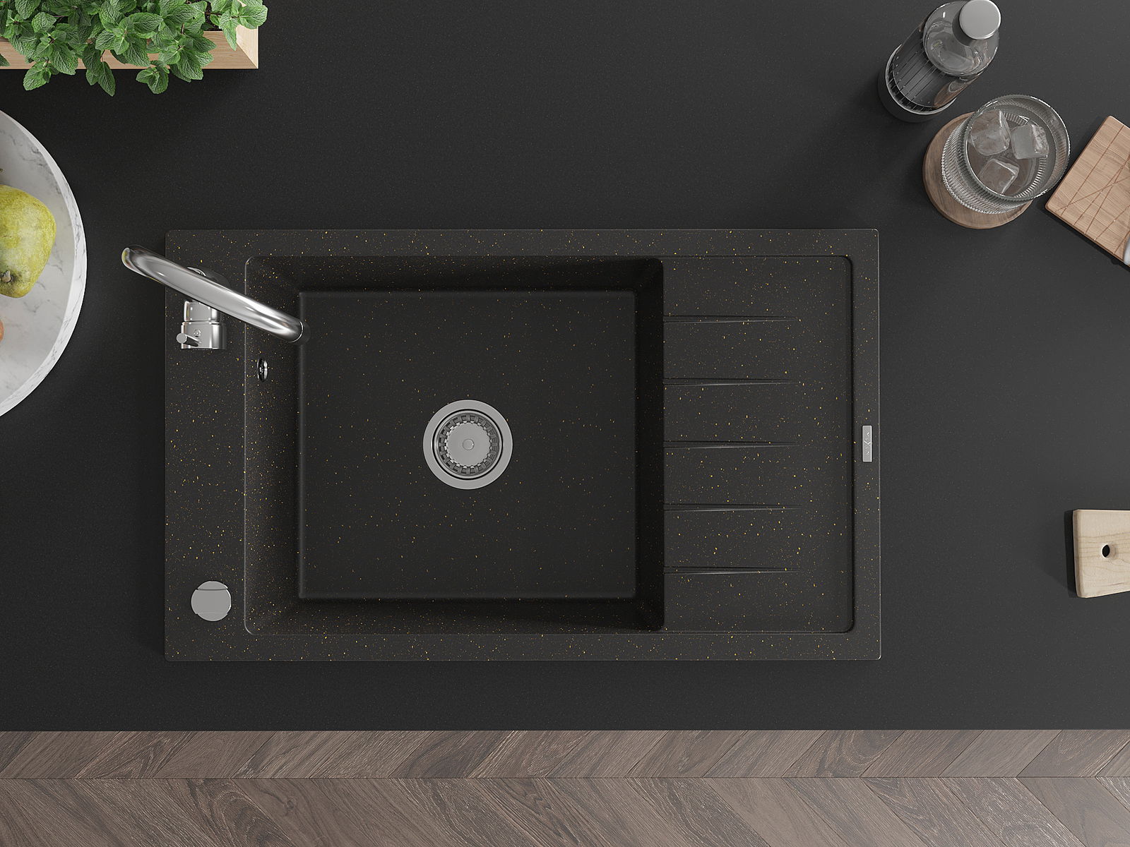 Mexen Elias granitinė vienos kameros plautuvė su nutekamuoju paviršiumi ir virtuvės maišytuvu Telma, juoda/auksinė
