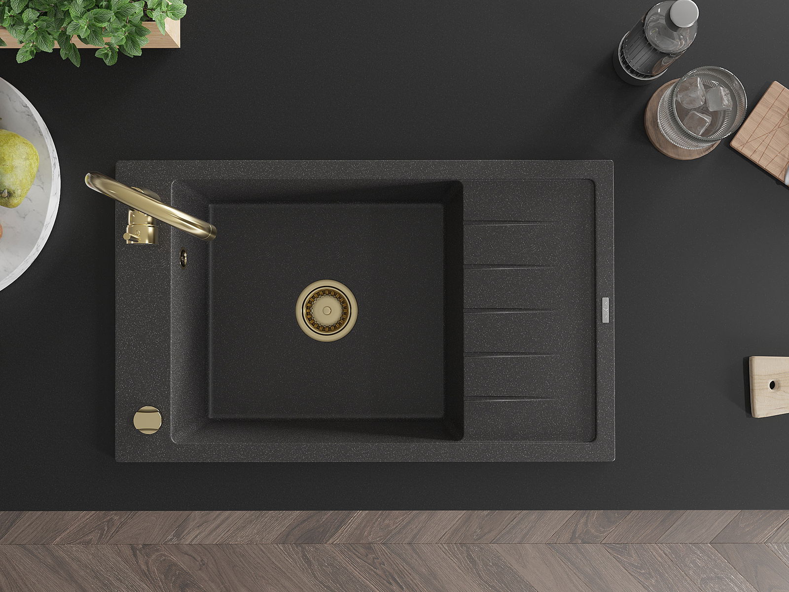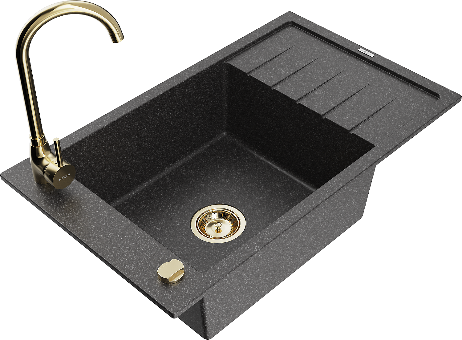 Mexen Elias granitinė vienos kameros kriauklė su nusausintuvu ir virtuvės maišytuvu Telma, juoda dėmėta