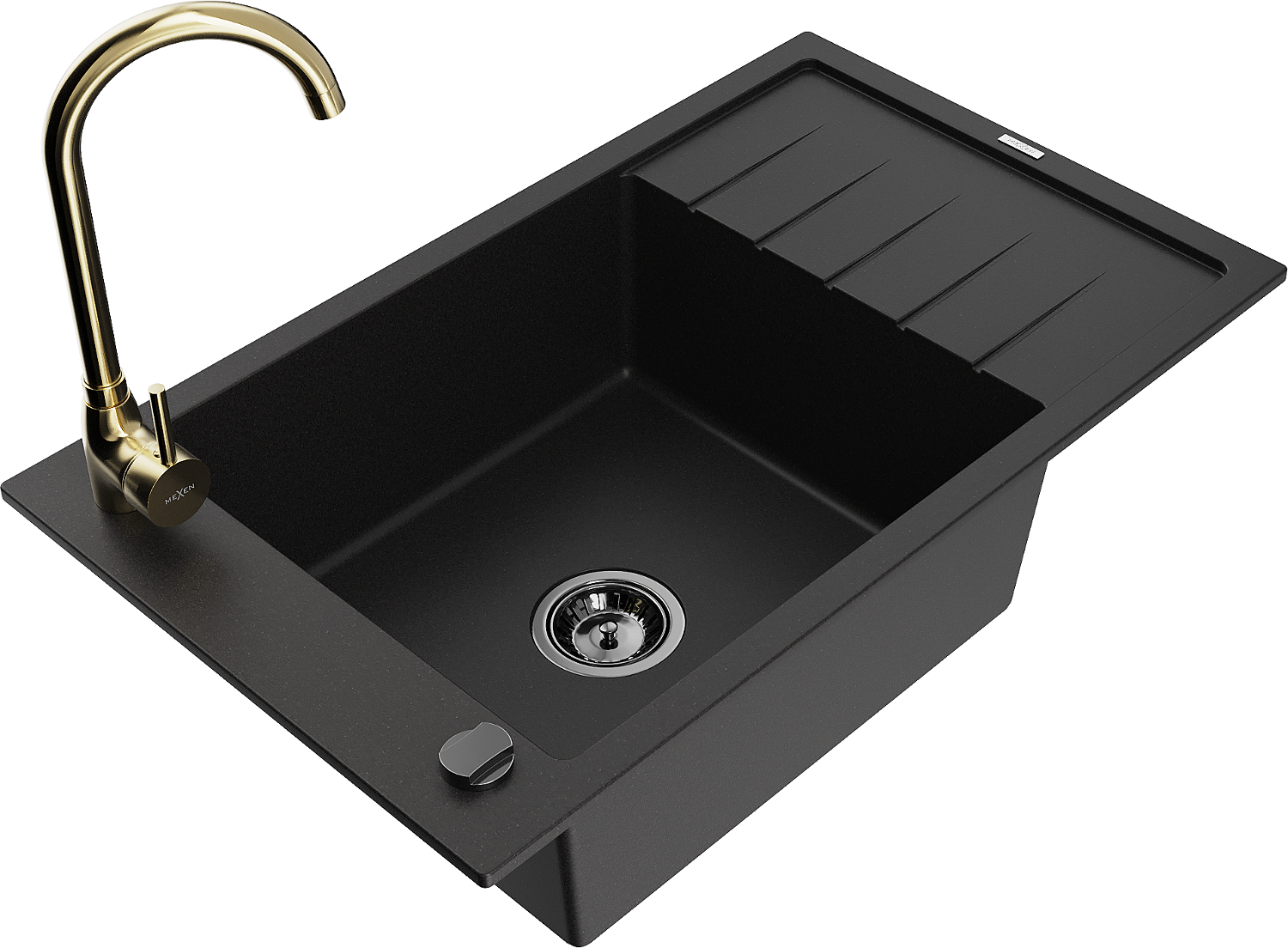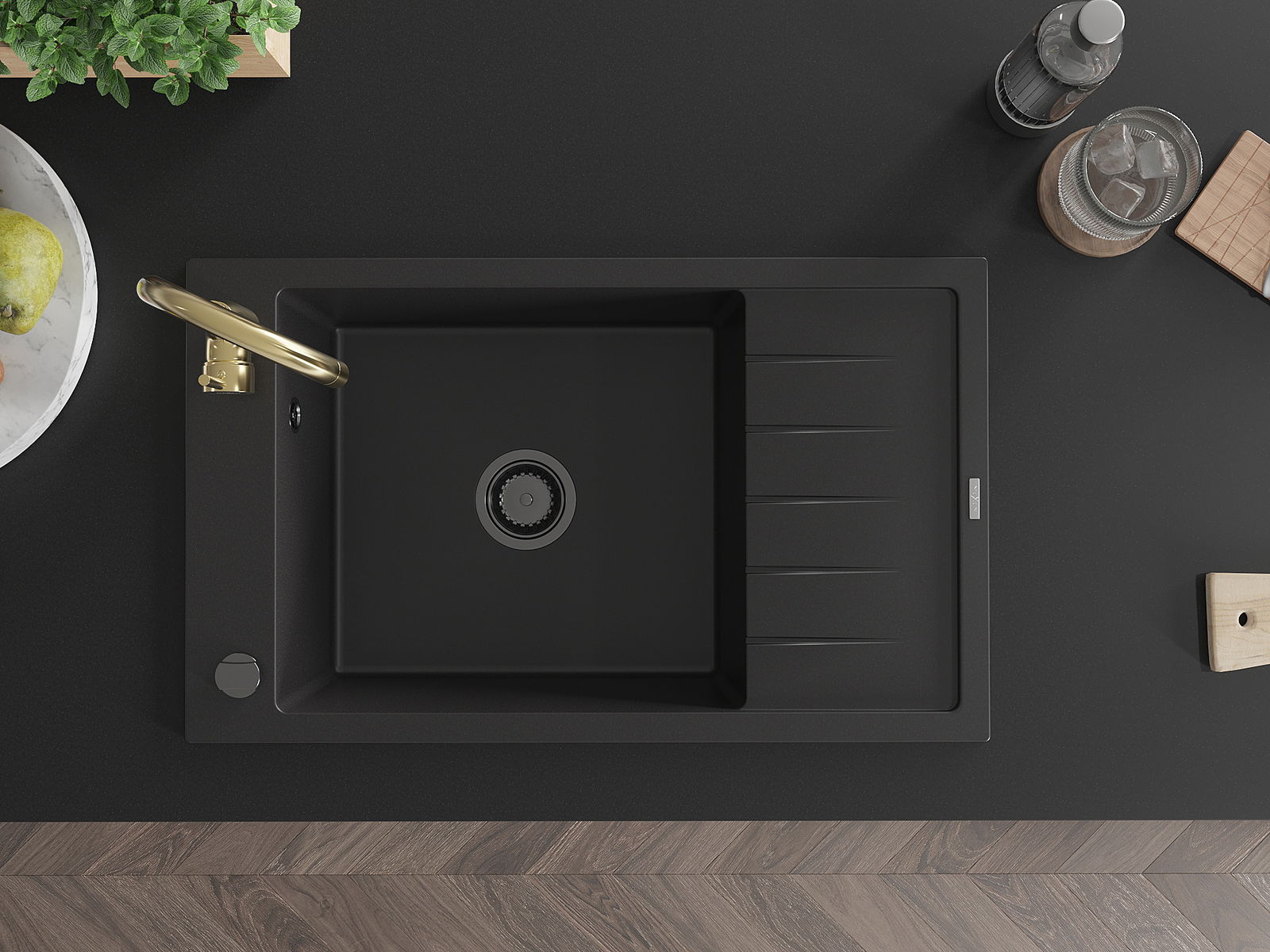 Mexen Elias vienos kameros granito plautuvė su nusausinimo lentele ir virtuviniu maišytuvu Telma, juoda - 6511-77-670200-50-B