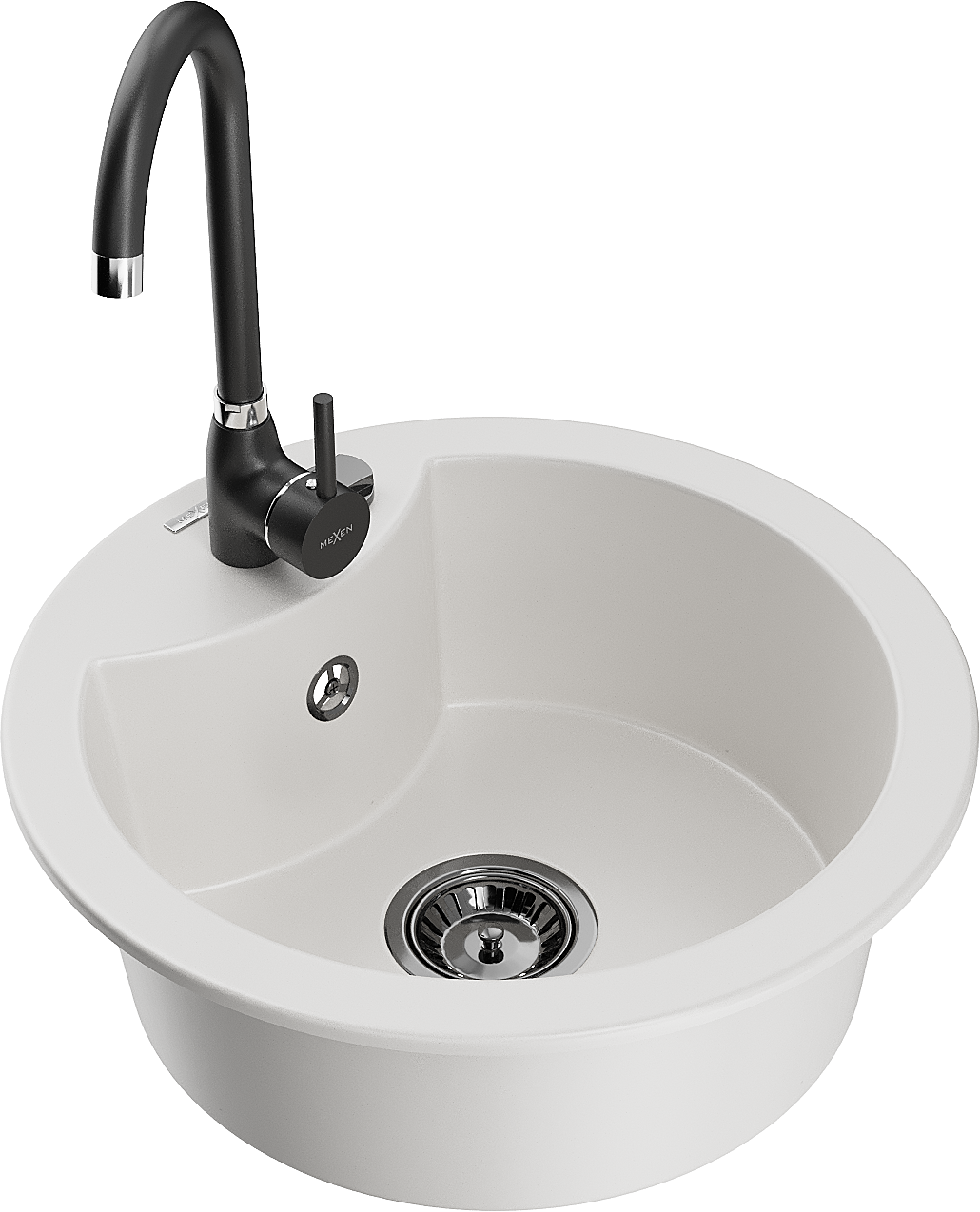 Mexen Diego granitinė vienos kameros plautuvė su virtuviniu maišytuvu Telma, balta - 6512-20-670200-70