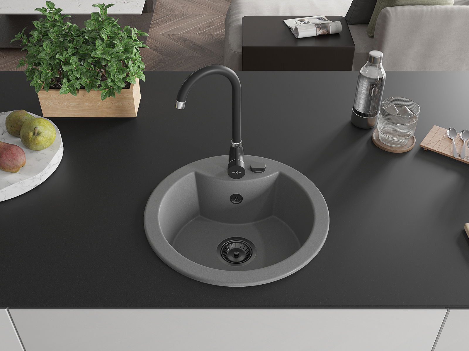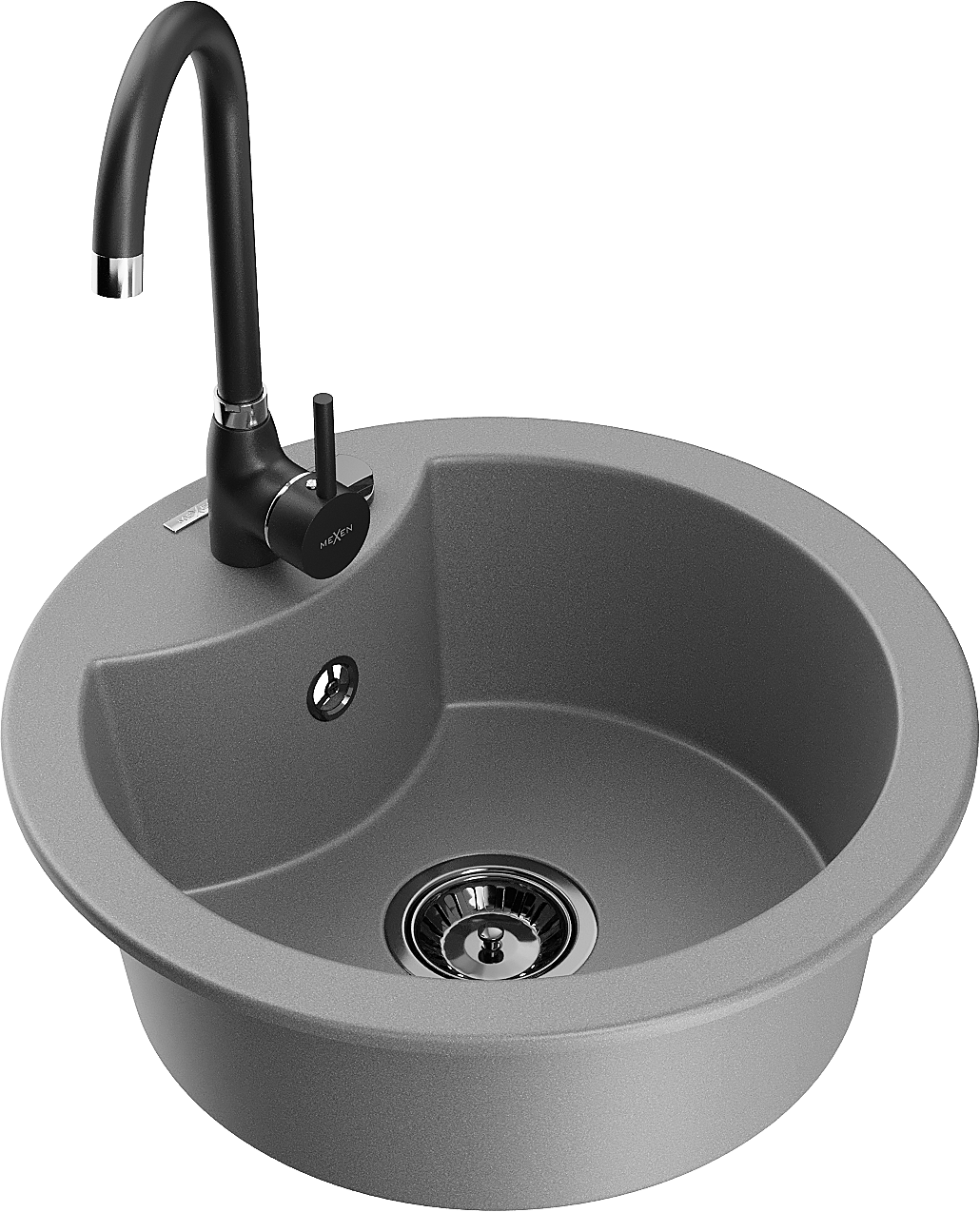 Mexen Diego granitinis vienos komoros virtuvės plautuvas su virtuviniu maišytuvu Telma, pilkas - 6512-71-670200-70-B