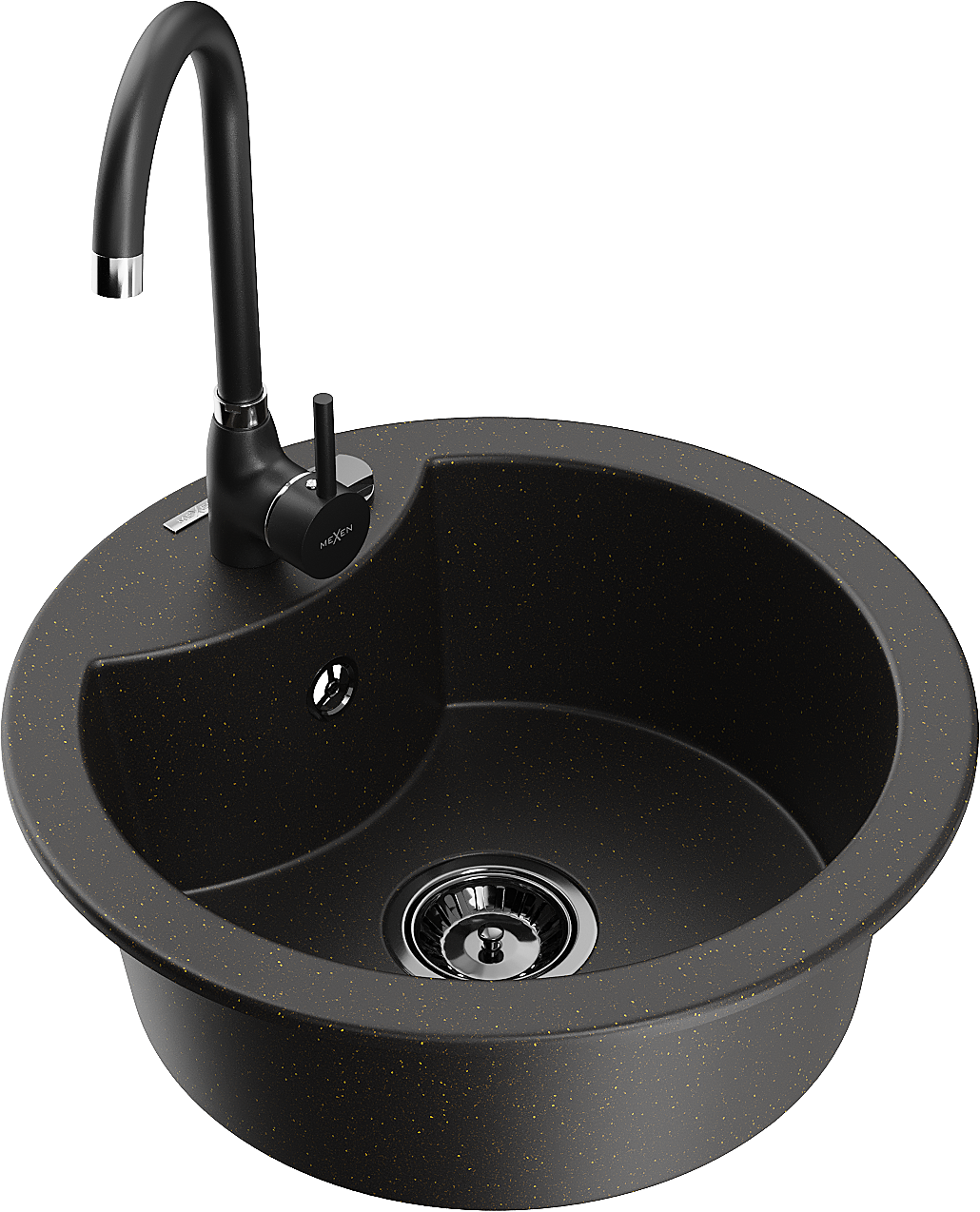 Mexen Diego granito plautuvė 1-kamerinė su Telma virtuviniu maišytuvu, juoda/auksinė - 6512-75-670200-70-B
