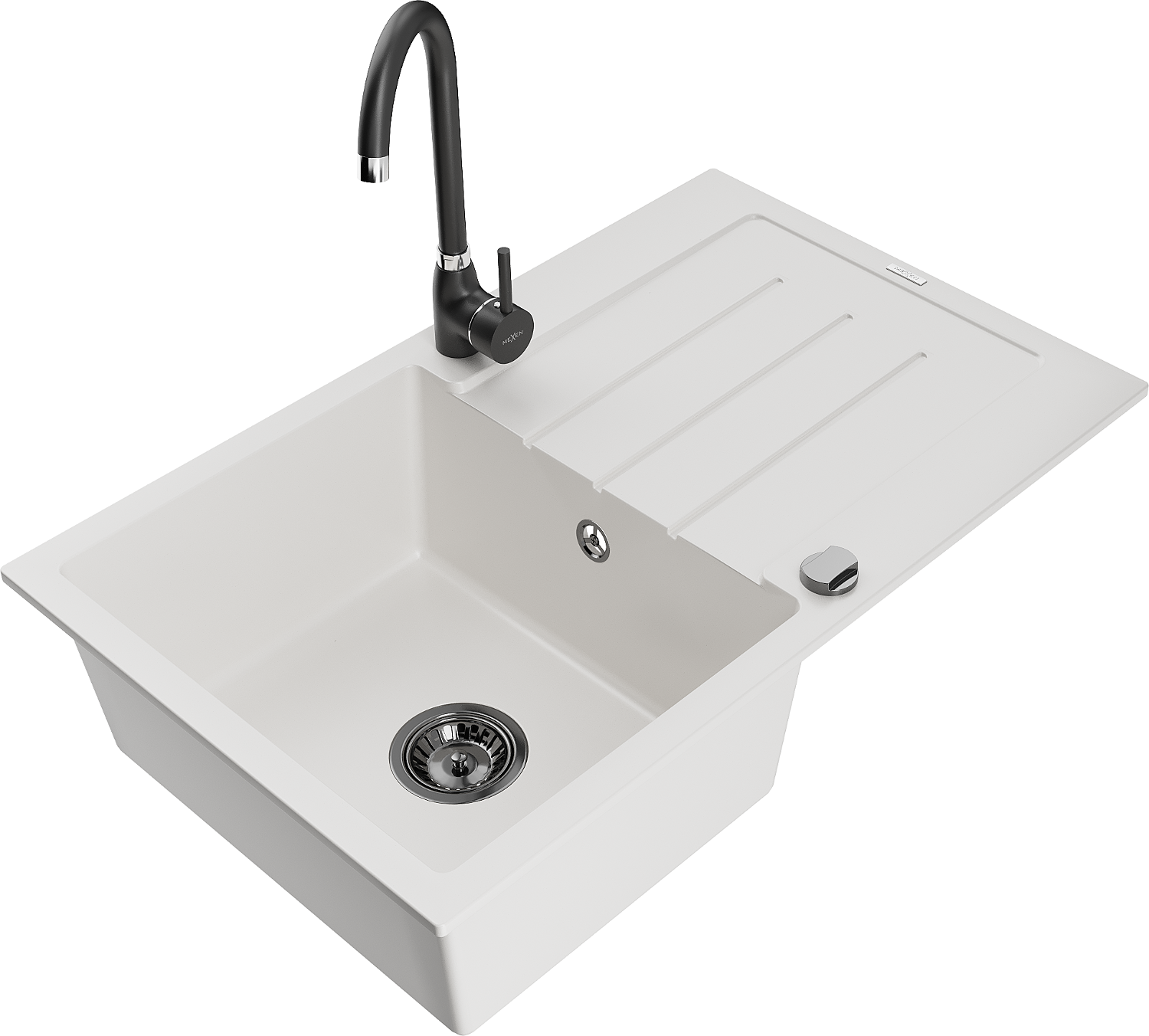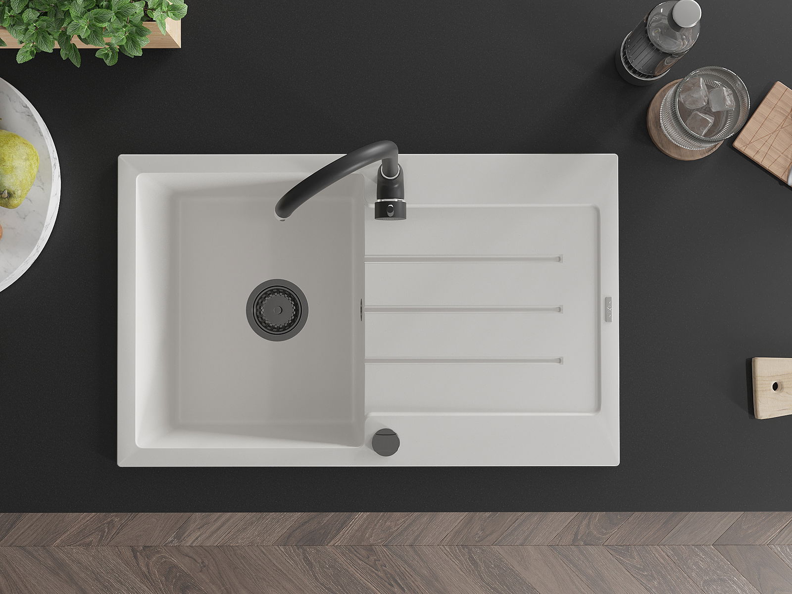 Mexen Bruno vienos dalies granito kriauklė su nusausinimo plokšte ir virtuviu maišytuvu Telma, balta - 6513-20-670200-70