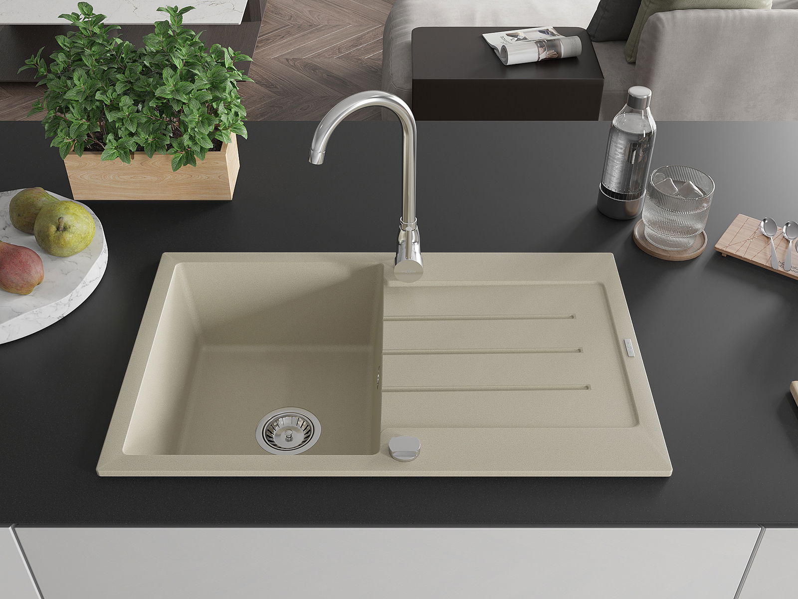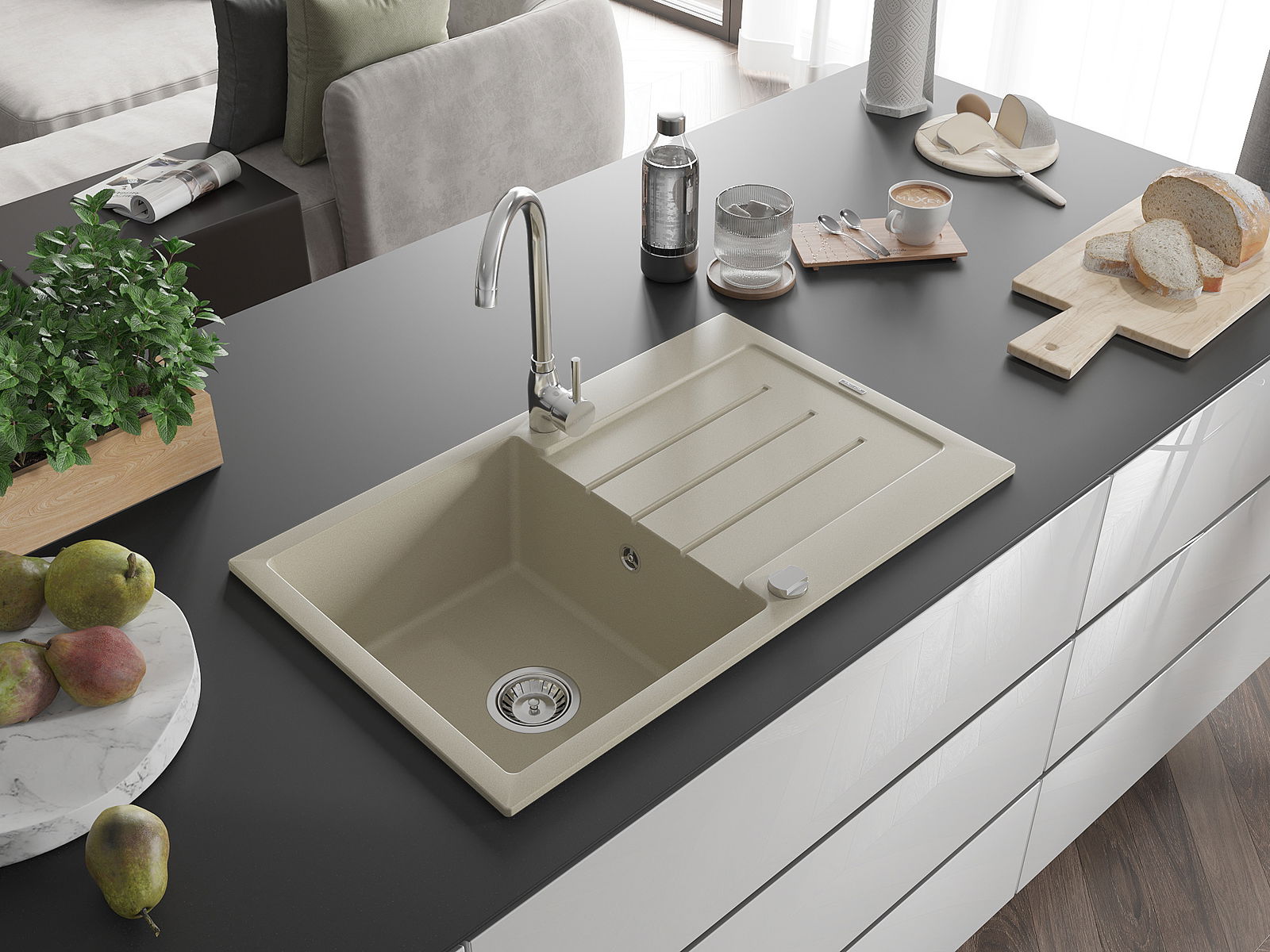 Mexen Bruno 1 dubens granitinė kriauklė su nusausintuvu ir virtuviniu maišytuvu Telma, smėlio spalvos - 6513-69-670200-00