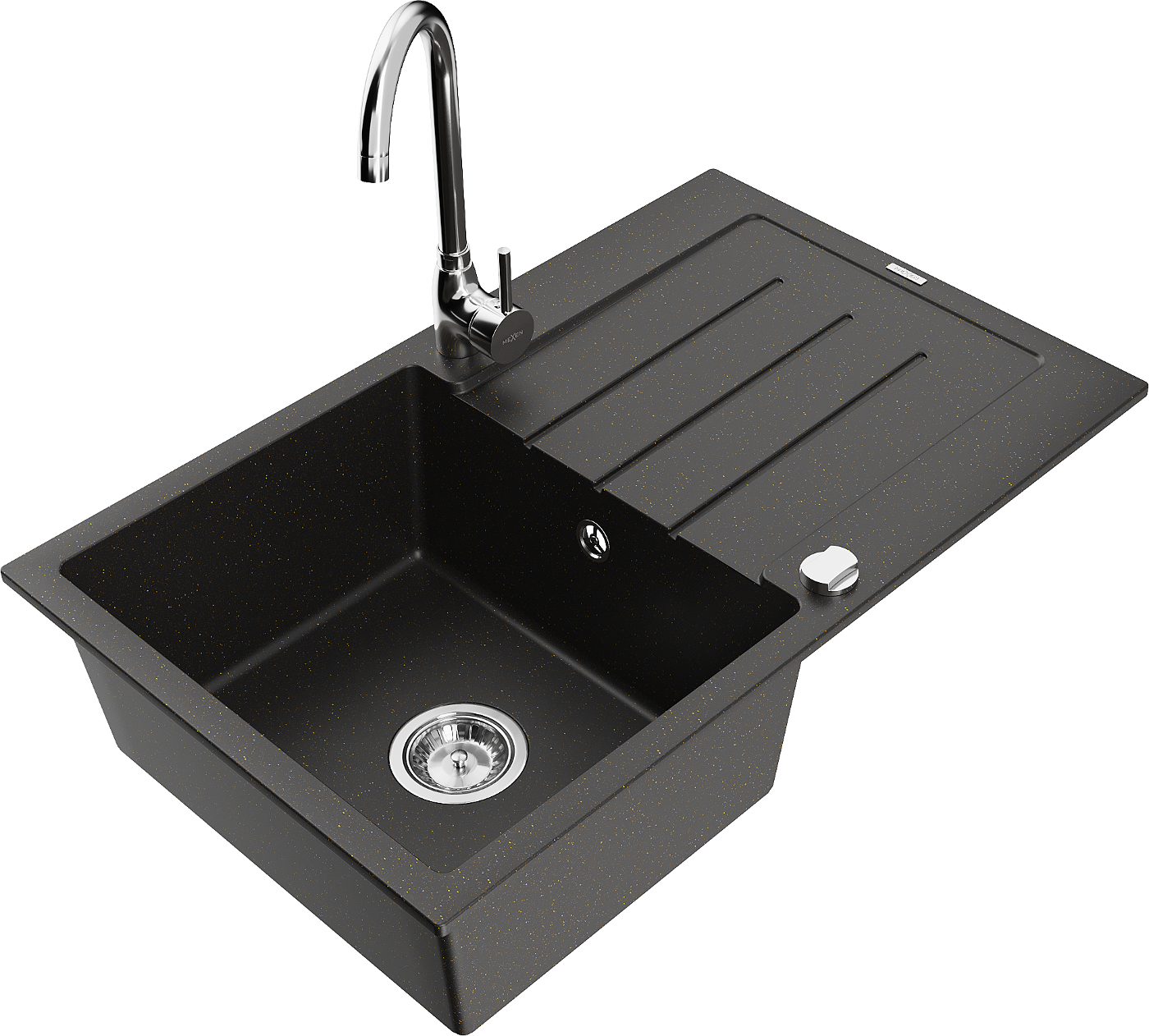 Mexen Bruno vienos kameros granitinė kriauklė su nutekamąja dalimi ir virtuvės maišytuvu Telma, juodas/auksinis