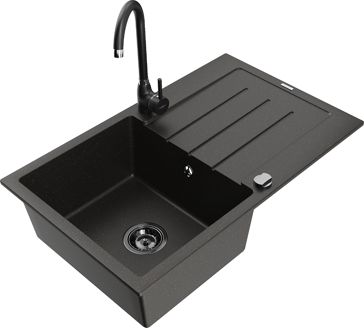Mexen Bruno granitinė 1-skylių plautuvė su nutekėjimu ir virtuviniais čiaupais Telma, juoda/auksinė - 6513-75-670200-70-B