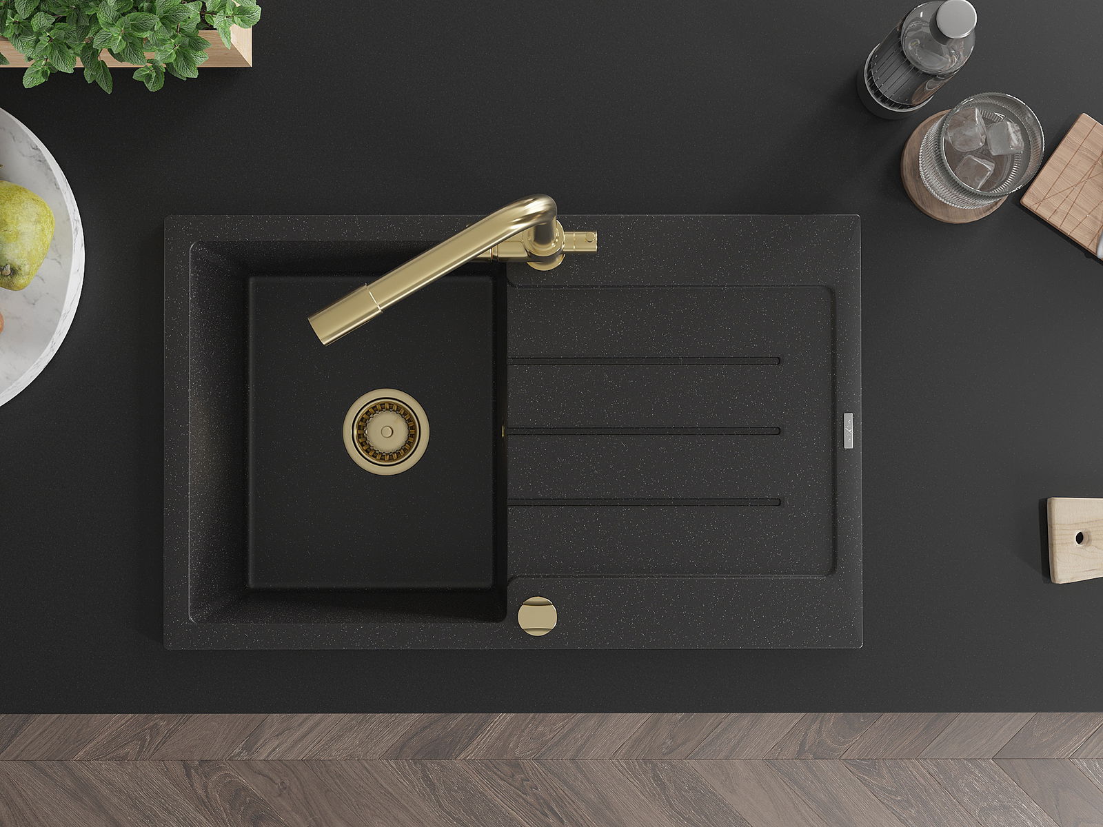 Mexen Bruno granitinė vienos kameros plautuvė su nutekamu lietumi ir virtuviniu maišytuvu Duero, juoda/sidabrinis metalikas