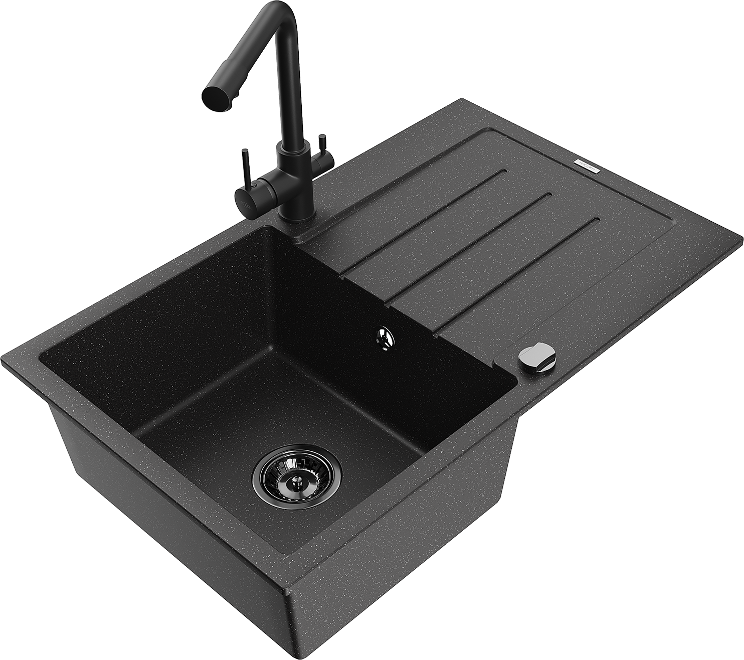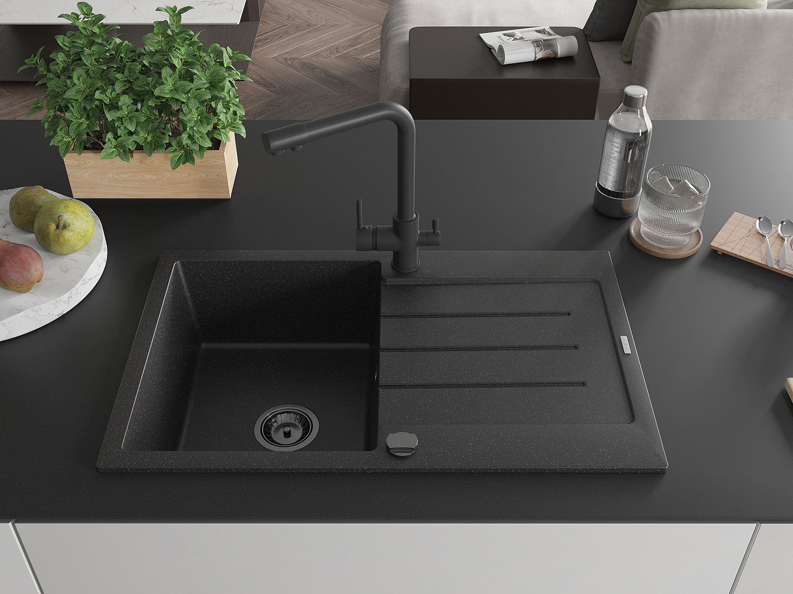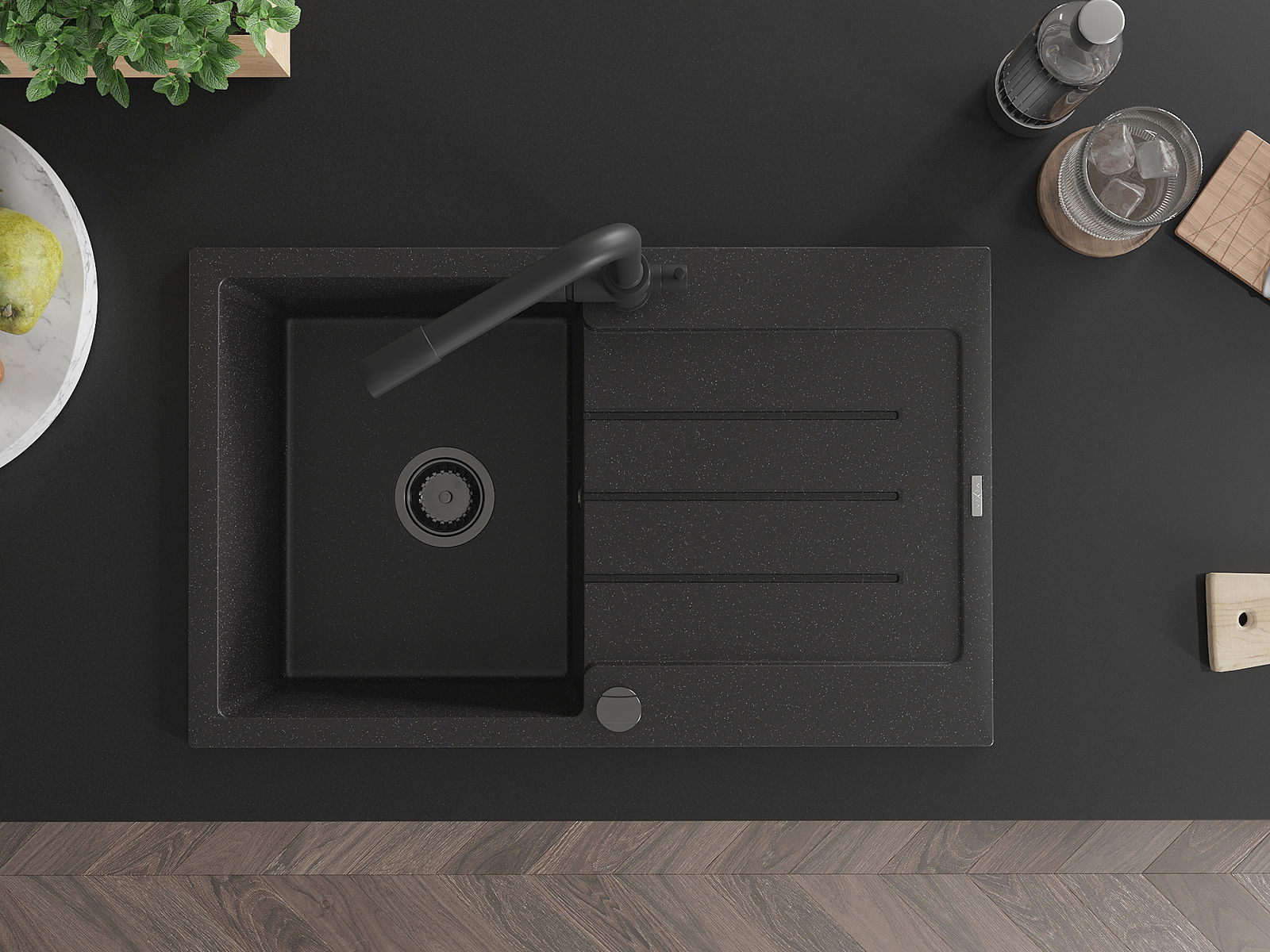 Mexen Bruno granitinė vienos kameros kriauklė su nutekamąja dalimi ir virtuviniu maišytuvu Duero, juoda/sidabrinis metalikas