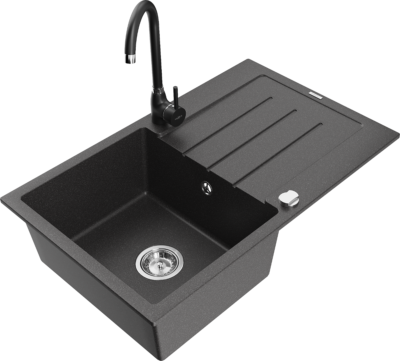 Mexen Bruno granitinė vienos dubenėlės kriauklė su nusausintuvu ir virtuviniu maišytuvu Telma, juodai taškuota