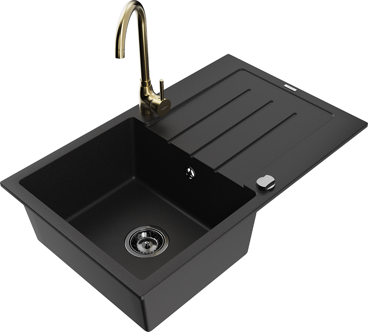 Mexen Bruno granito virtuvinė kriauklė su viena plautuve, nuvarvėjimo zona ir Telma maišytuvu, juoda - 6513-77-670200-50-B