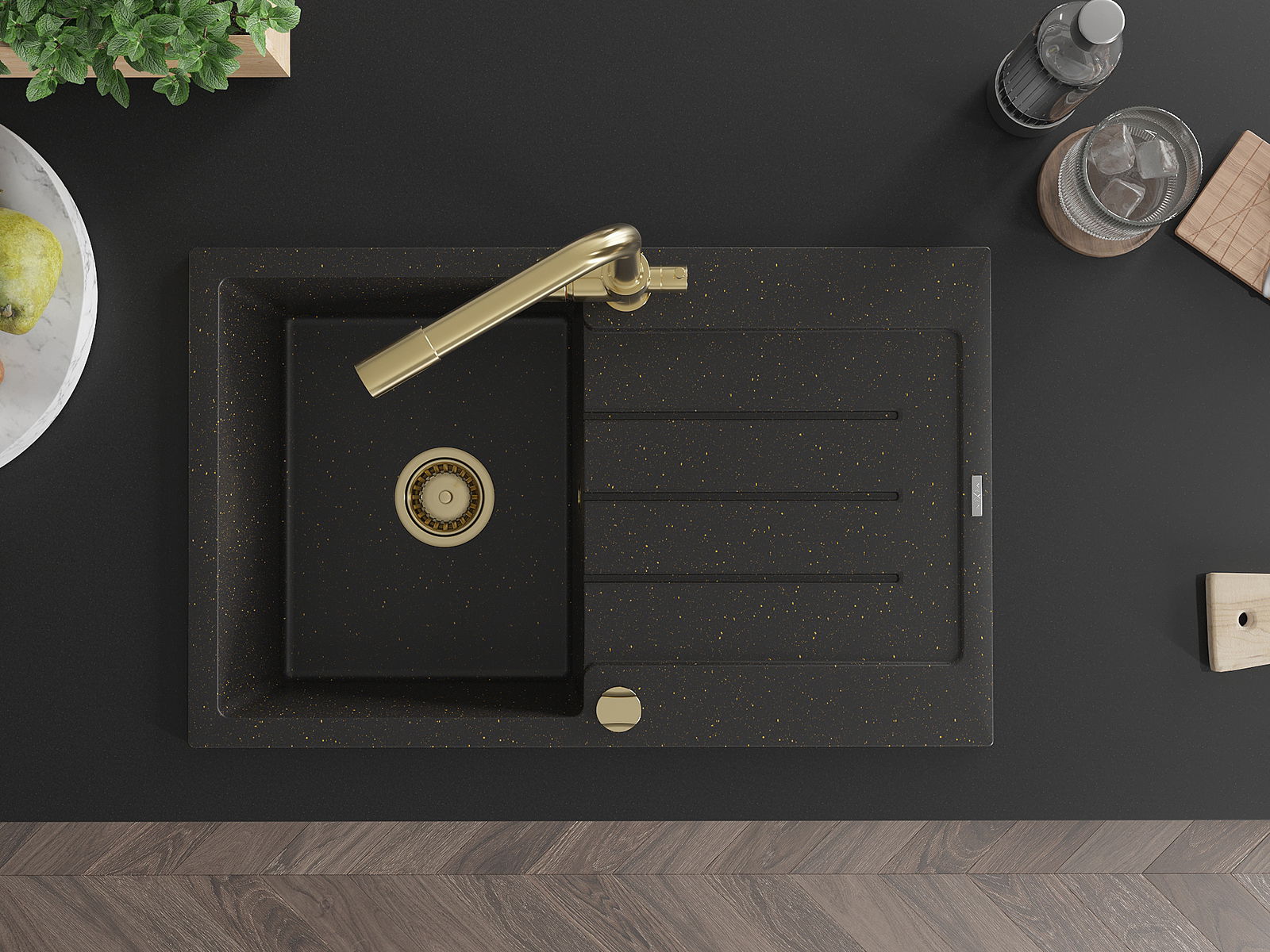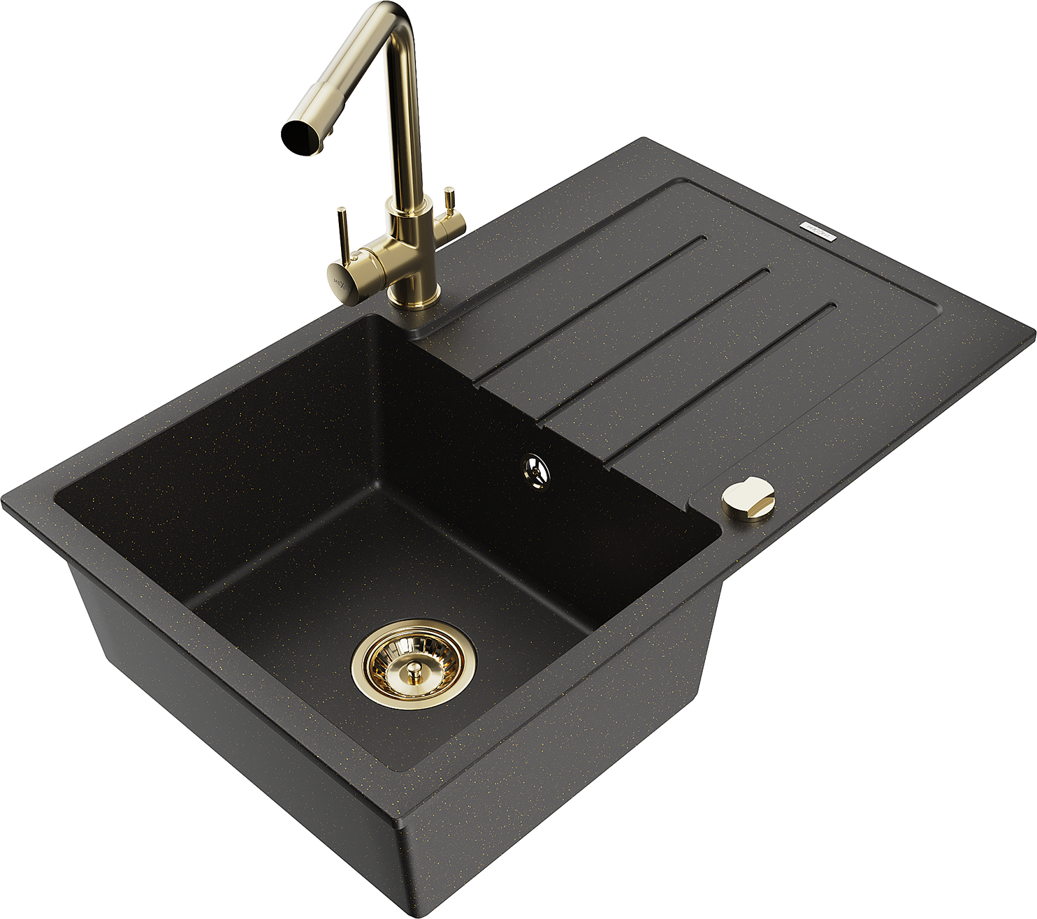 Mexen Bruno granitinė 1-masyvės plautuvė su lašintuvu ir virtuviniu maišytuvu Duero, juoda/auksinė - 6513-75-671600-50