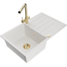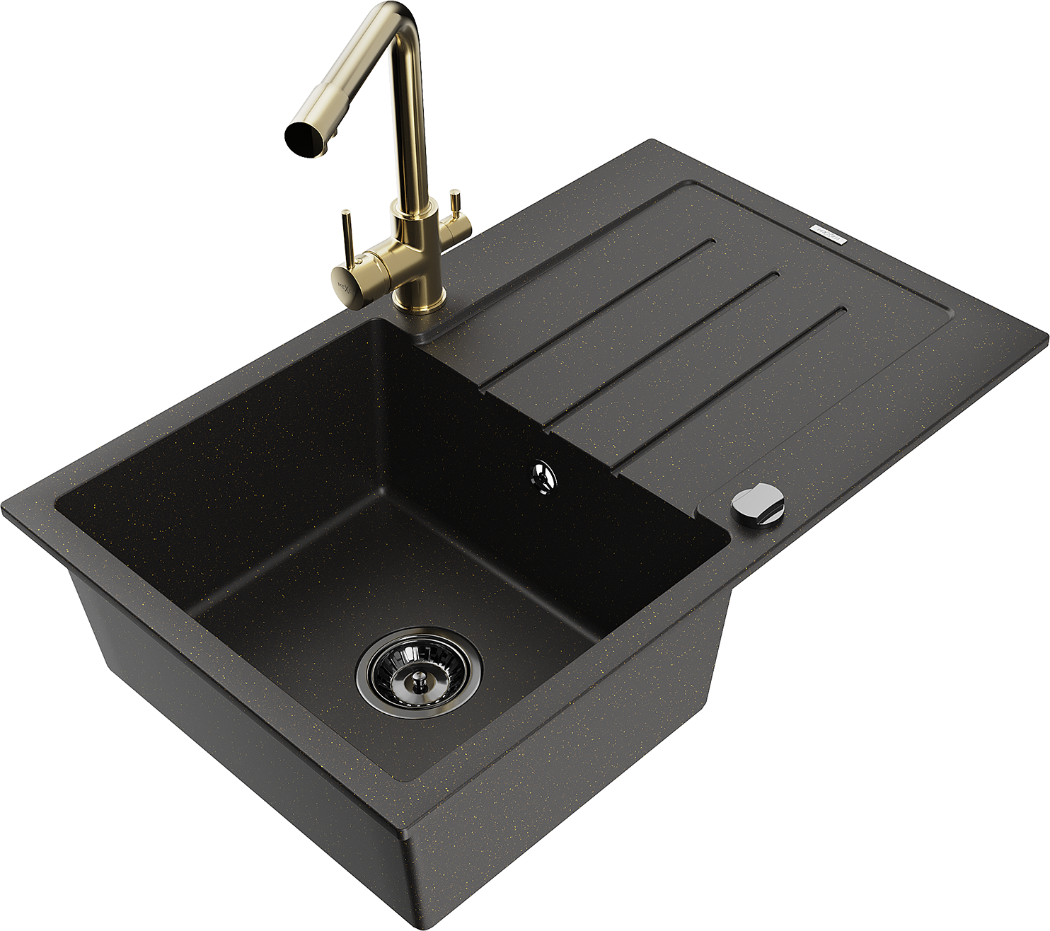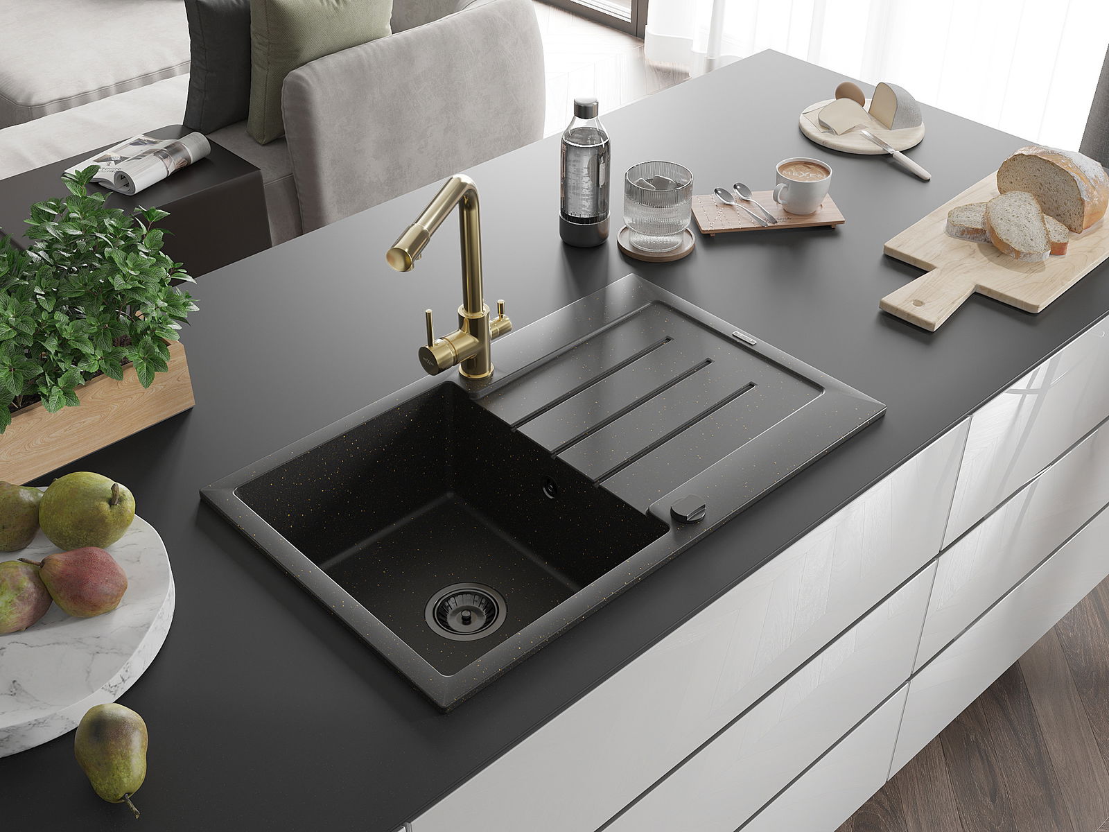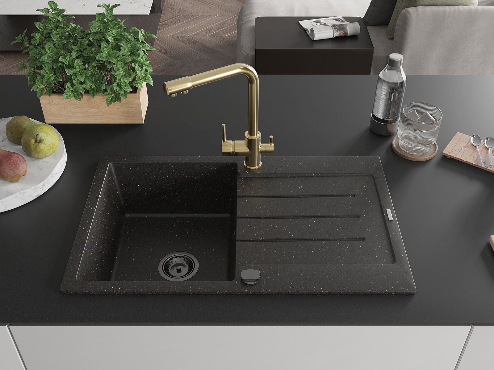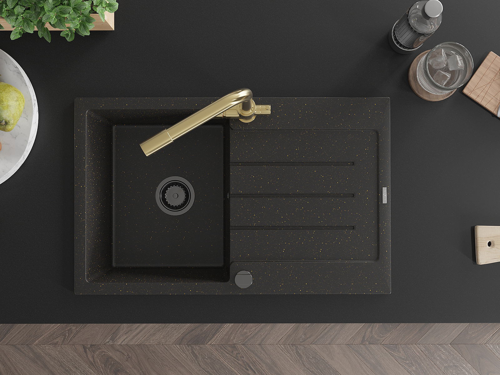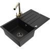 Mexen Bruno granitinė vienos sekcijos plautuvė su nubėgimo paviršiumi ir virtuviniu čiaupu Duero, juoda/auksinė metalo