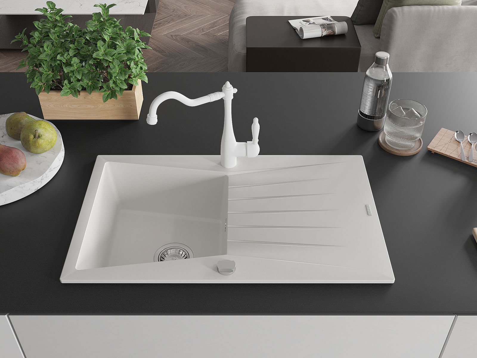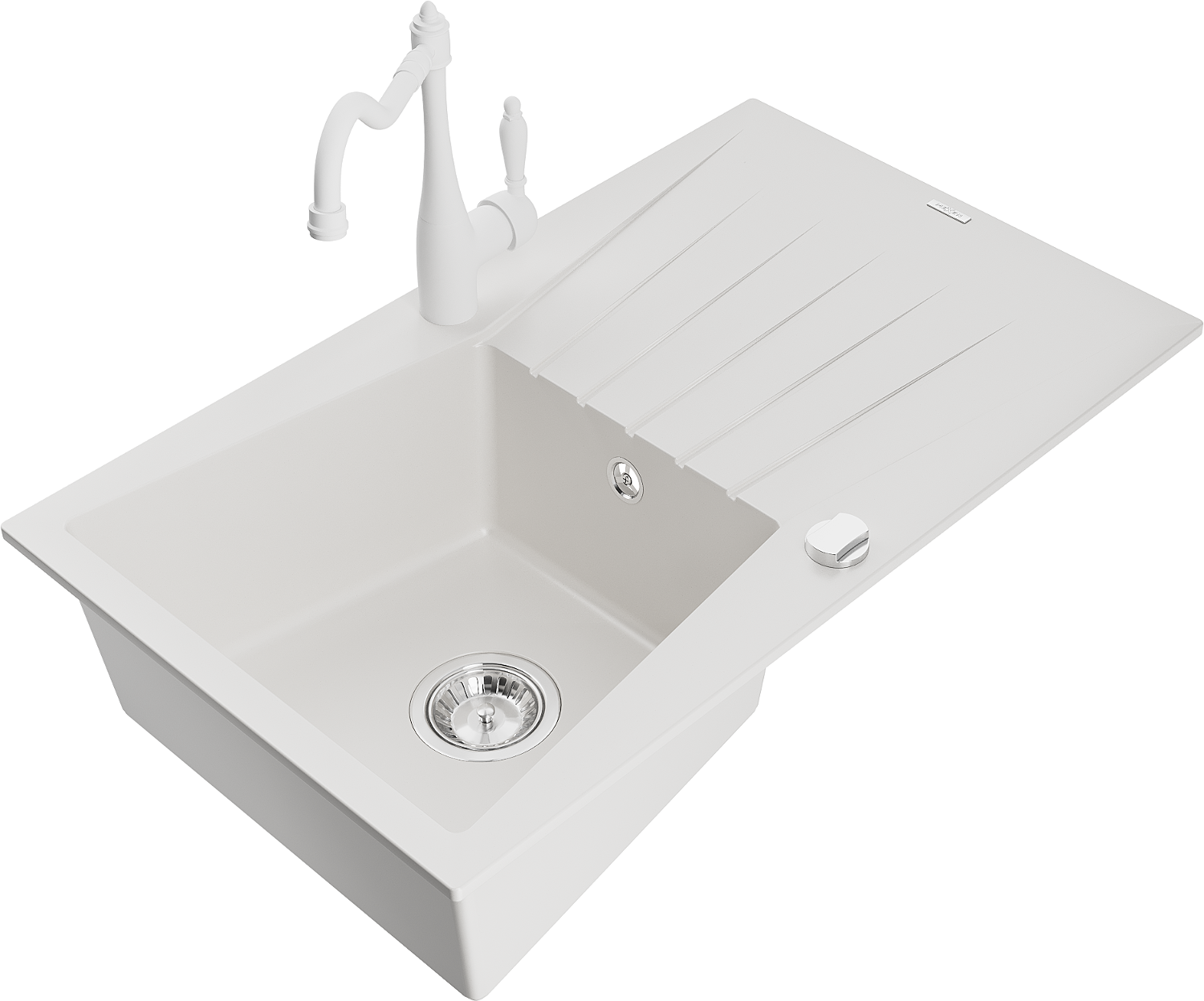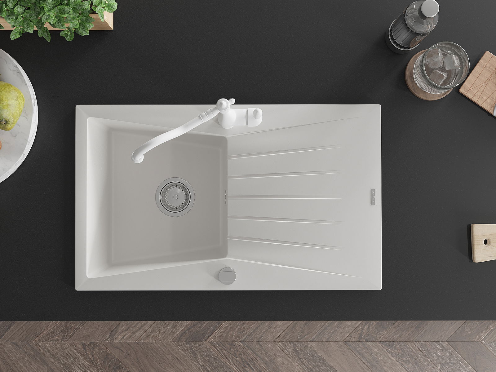 Mexen Cesar granito plautuvė su vienu dubeniu ir nusausintuvu bei virtuviniu maišytuvu Carla, balta - 6514-20-670700-20