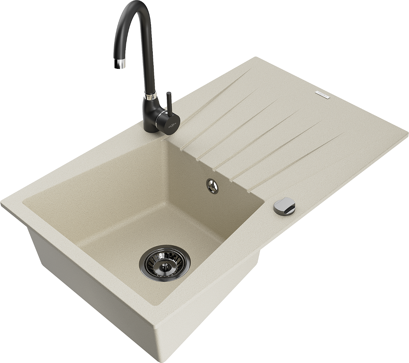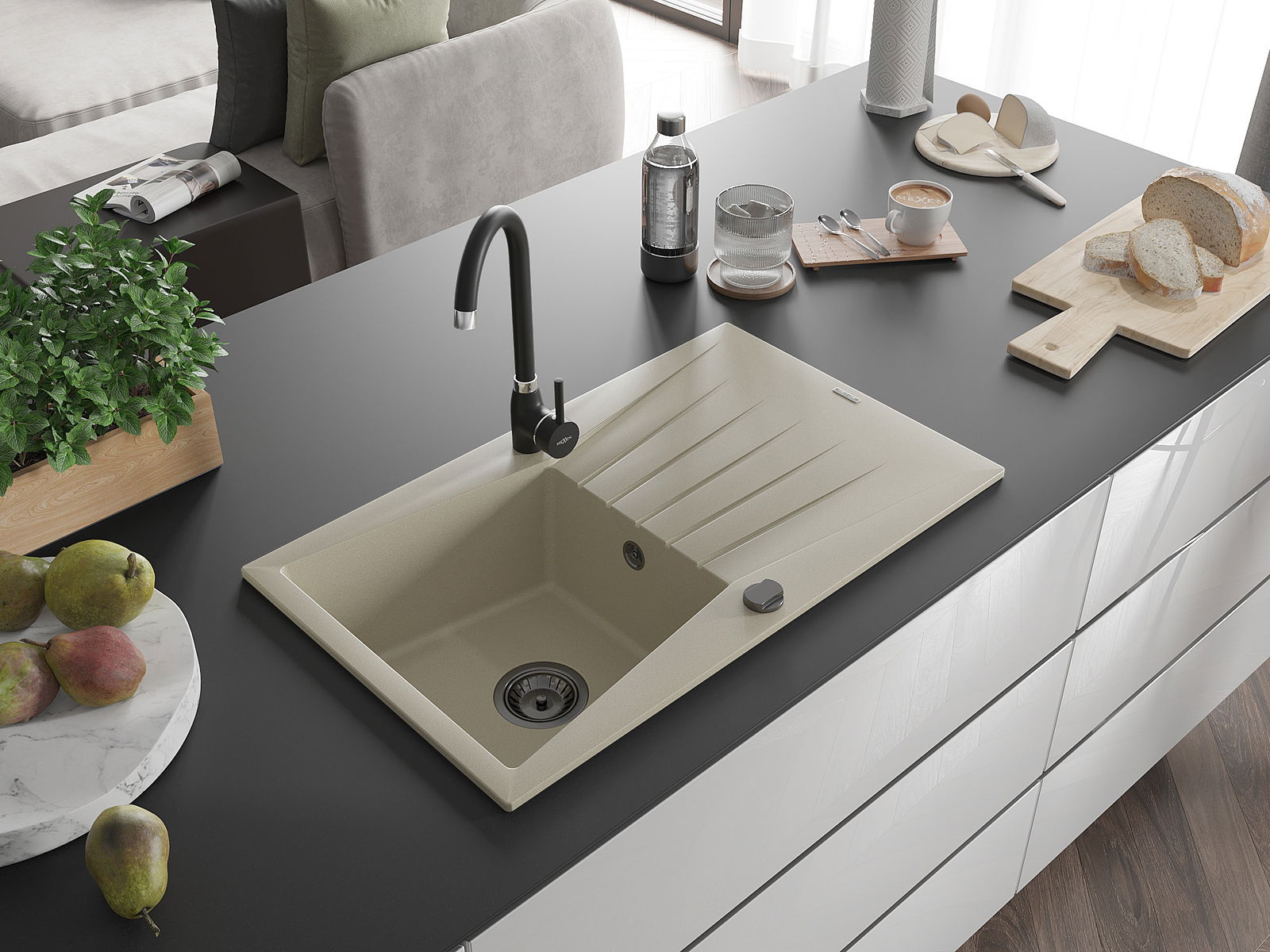 Mexen Cesar granitinė vienos kameros kriauklė su nuvarvėjimo zona ir Telma virtuviniu maišytuvu, smėlio spalvos