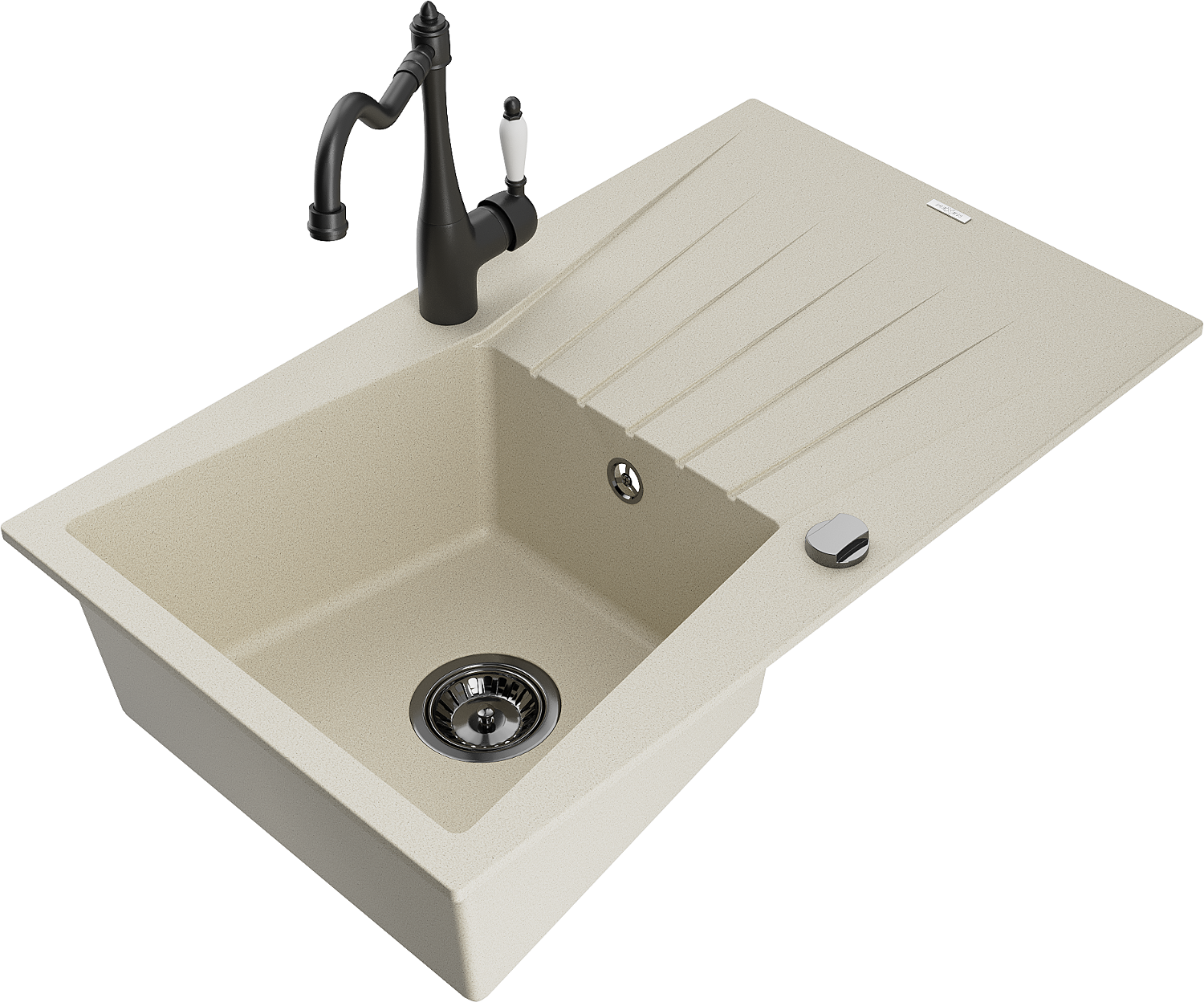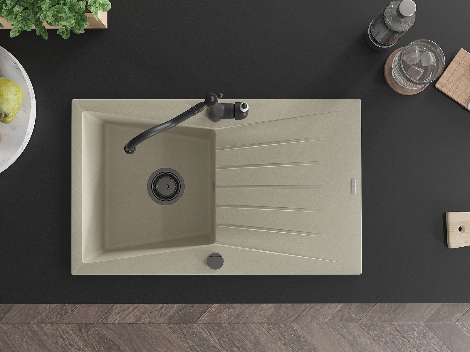 Mexen Cesar granito plautuvė 1-skyrius su drenažu ir virtuvės maišytuvu Carla, smėlio spalvos - 6514-69-670700-70