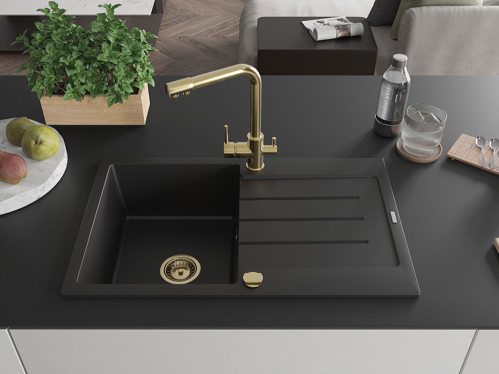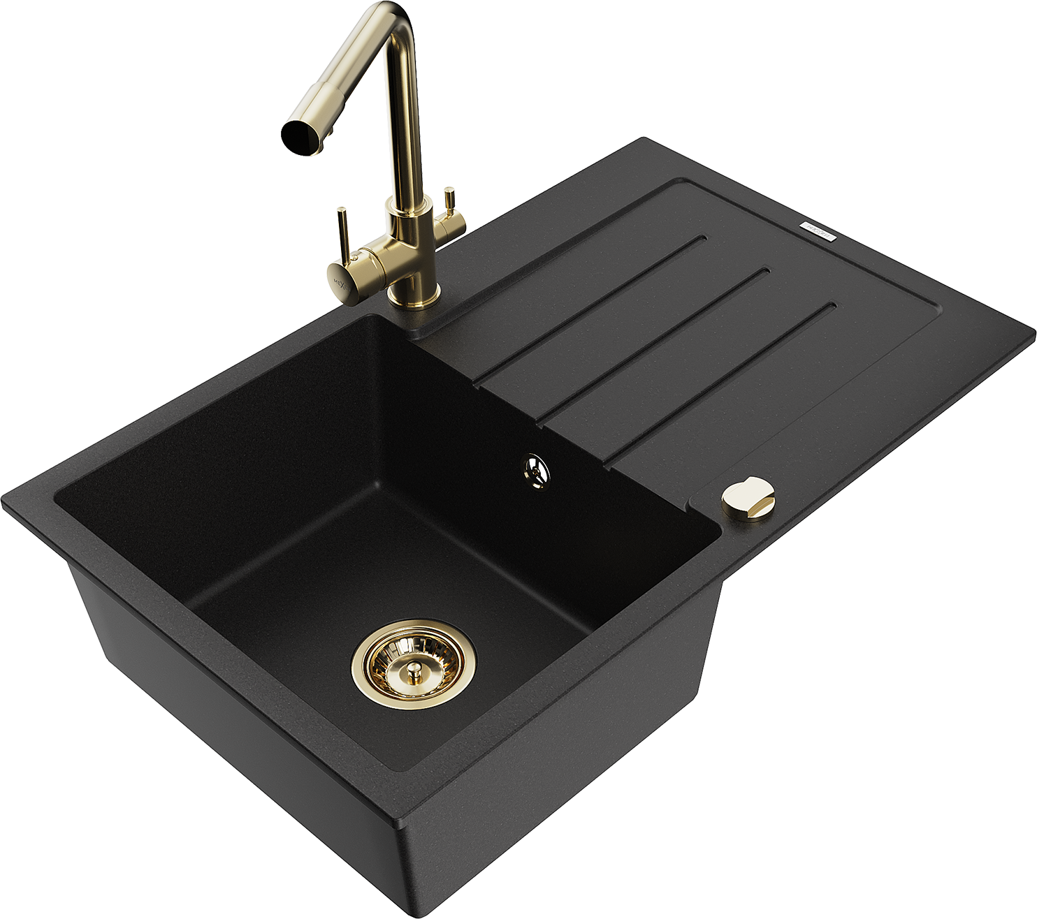 Mexen Bruno granitinis vienos kameros plautuvė su nutekėjimu ir virtuviniu maišytuvu Duero, juodas - 6513-77-671600-50