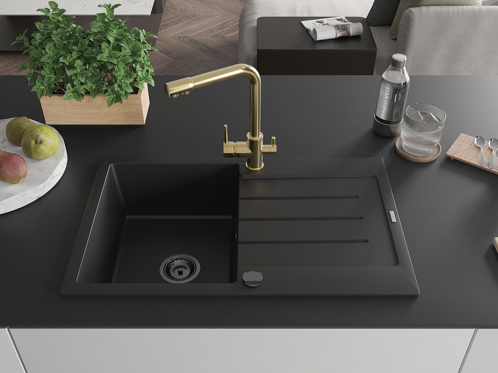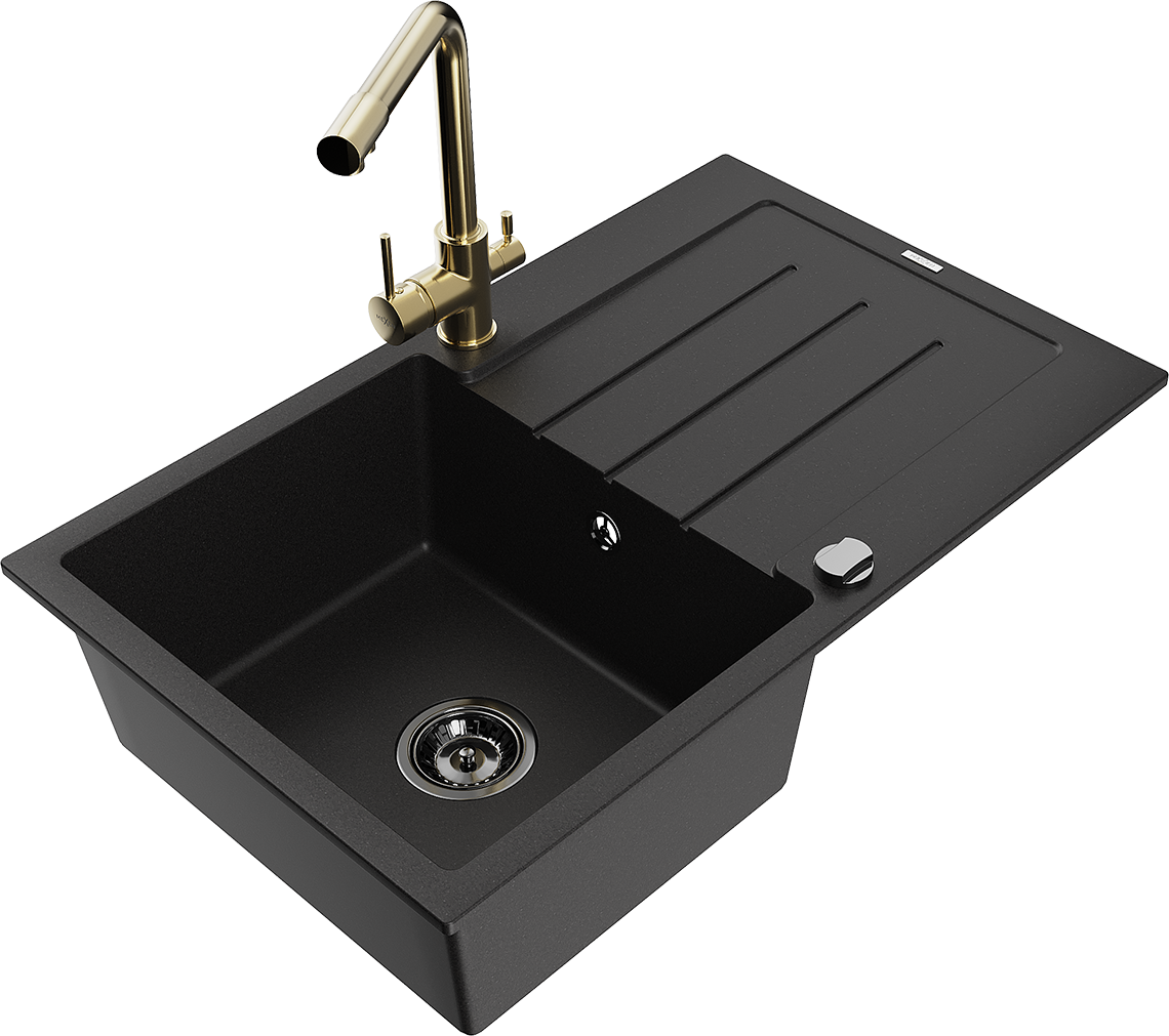 Mexen Bruno granitinė vieno dubens plautuvė su lašėtuvu ir virtuviniu čiaupu Duero, juoda - 6513-77-671600-50-B