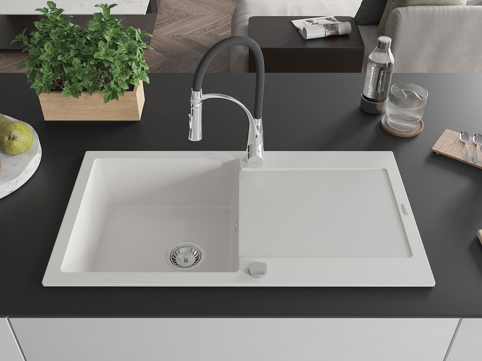 Mexen Leo granitinis vienos kameros plautuvė su laikikliu ir virtuviniu maišytuvu Aster, balta - 6501-20-73450-07