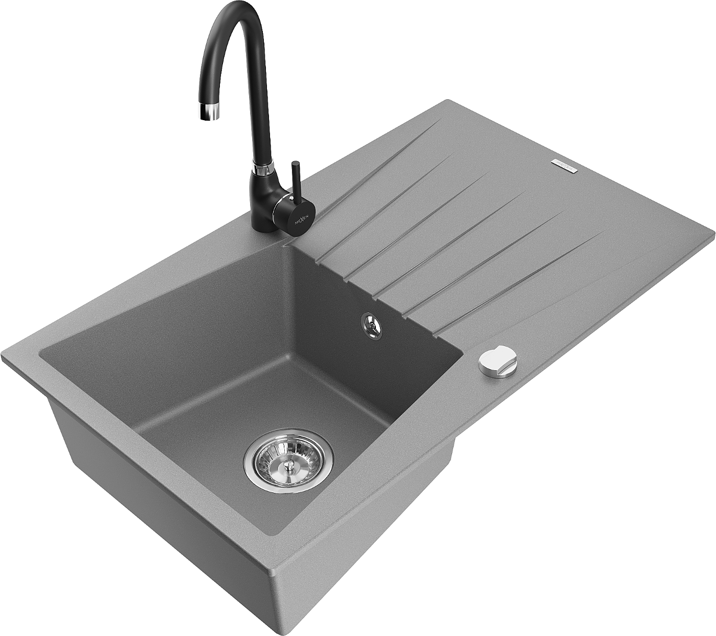 Mexen Cesar granitinis vienos kameros kriauklė su nusausintuvu ir Telma virtuvės maišytuvu, pilkas - 6514-71-670200-70