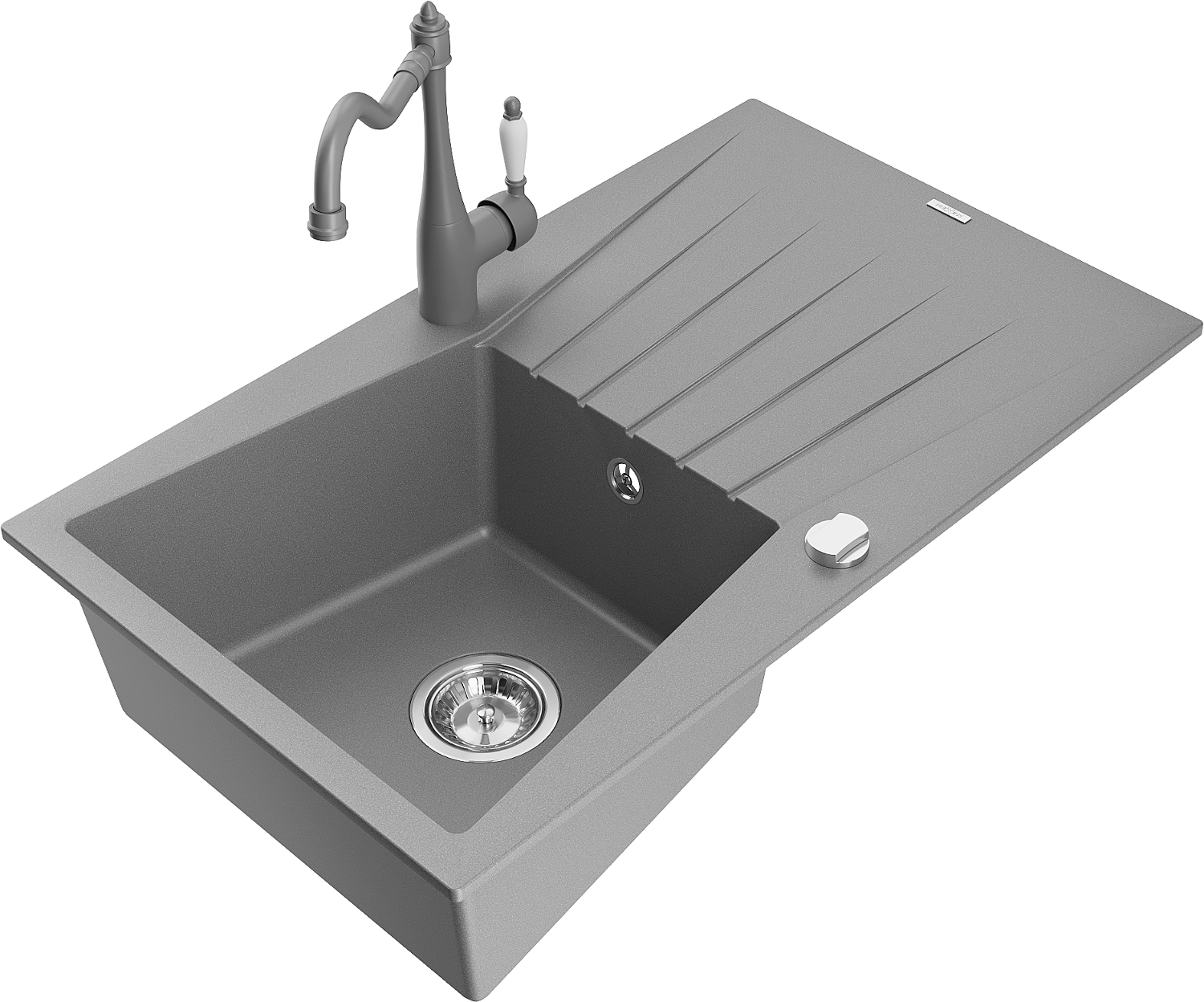 Mexen Cesar granitinė vienos kameros kriauklė su nusausinimo skyriumi ir virtuviniu maišytuvu Carla, pilka - 6514-71-670700-71