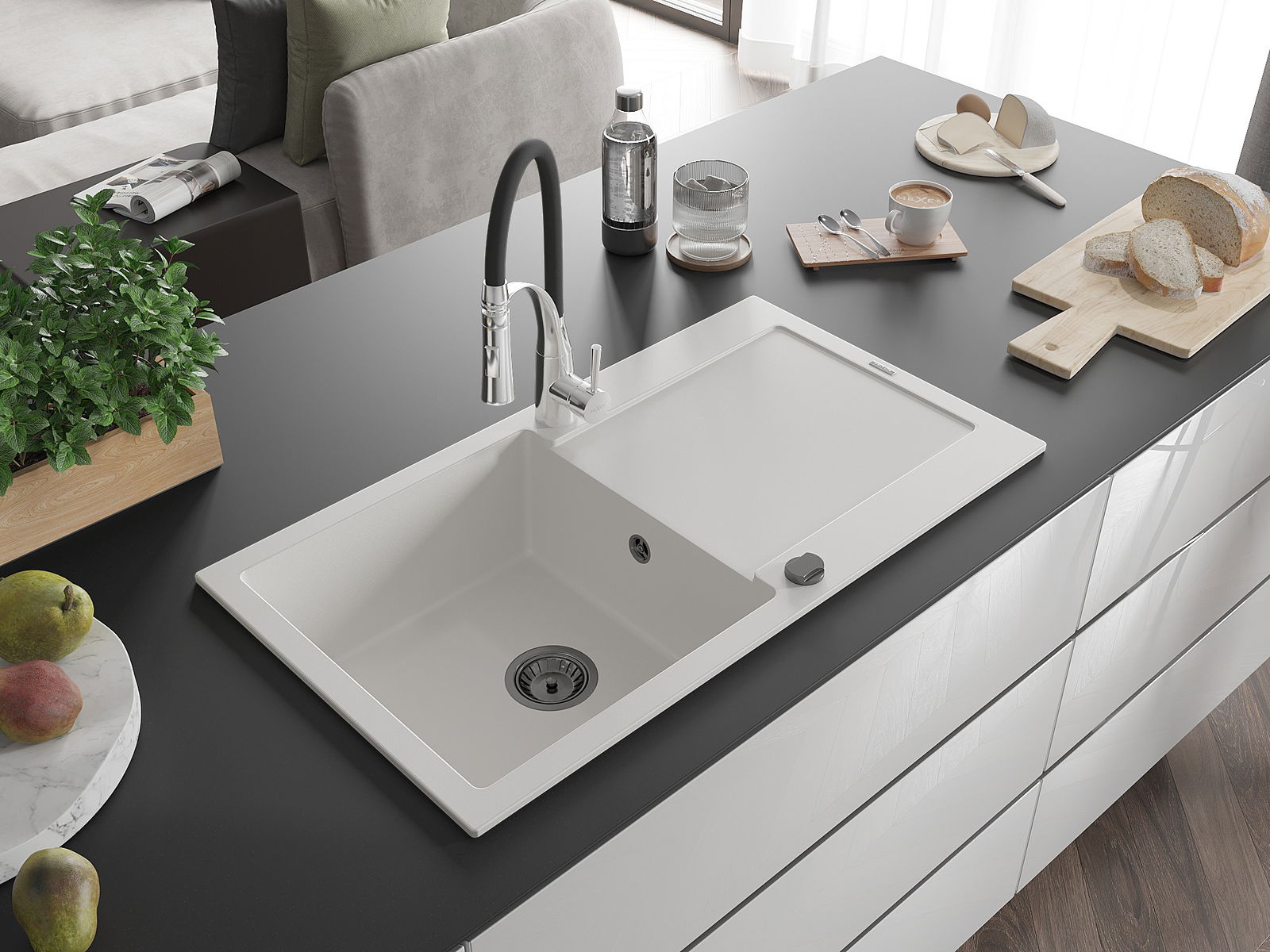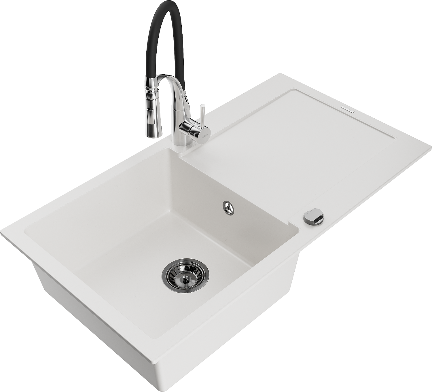 Mexen Leo granito plautuvė su 1 skyriumi ir nusausintuvu bei virtuviniu maišytuvu Aster, balta - 6501-20-73450-07-B