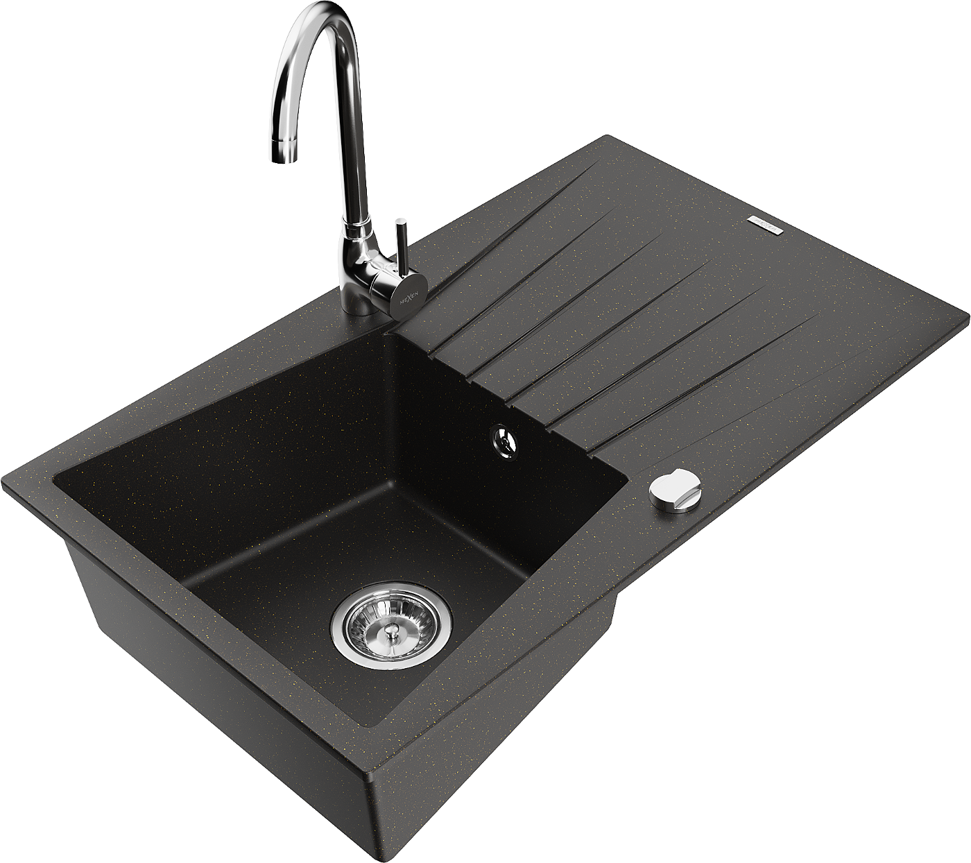 Mexen Cesar granitinė vieno dubens plautuvė su nutekėjimu ir virtuviniu čiaupu Telma, juoda/aukso - 6514-75-670200-00