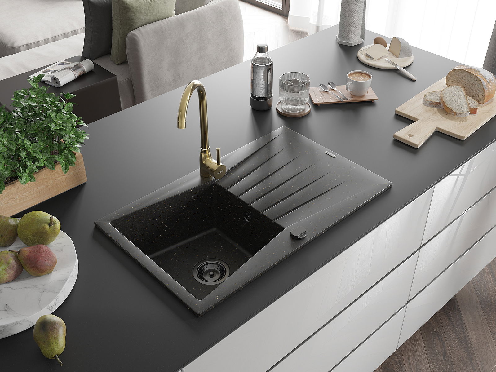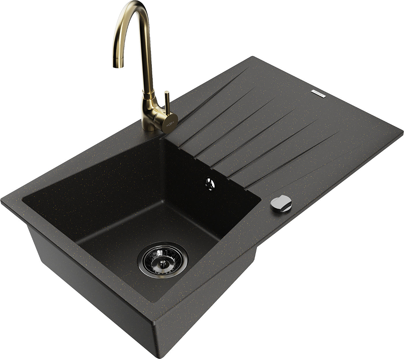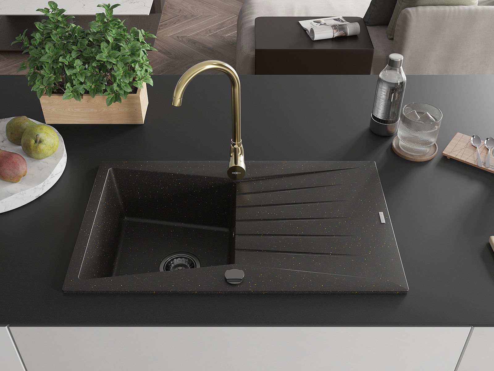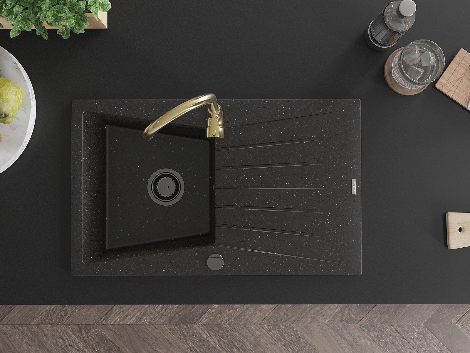 Mexen Cesar granitinė vienos plautuvės kriauklė su nusausintuvu ir virtuviniu maišytuvu Telma, juoda/aukso