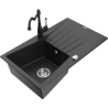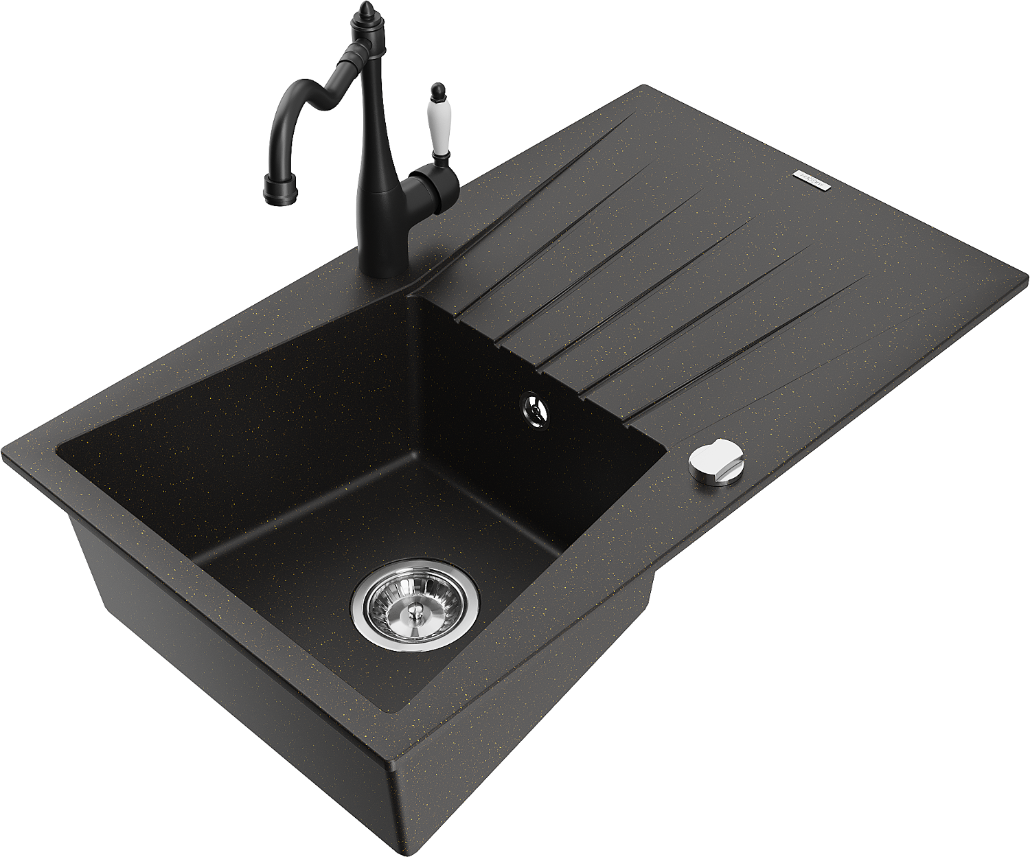 Mexen Cesar vienos kameros granitinė plautuvė su nutekėjimu ir virtuviniu maišytuvu Carla, juoda/auksinis metalikas