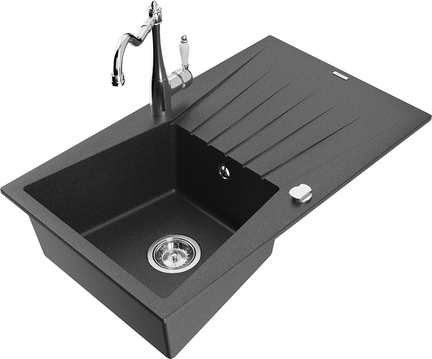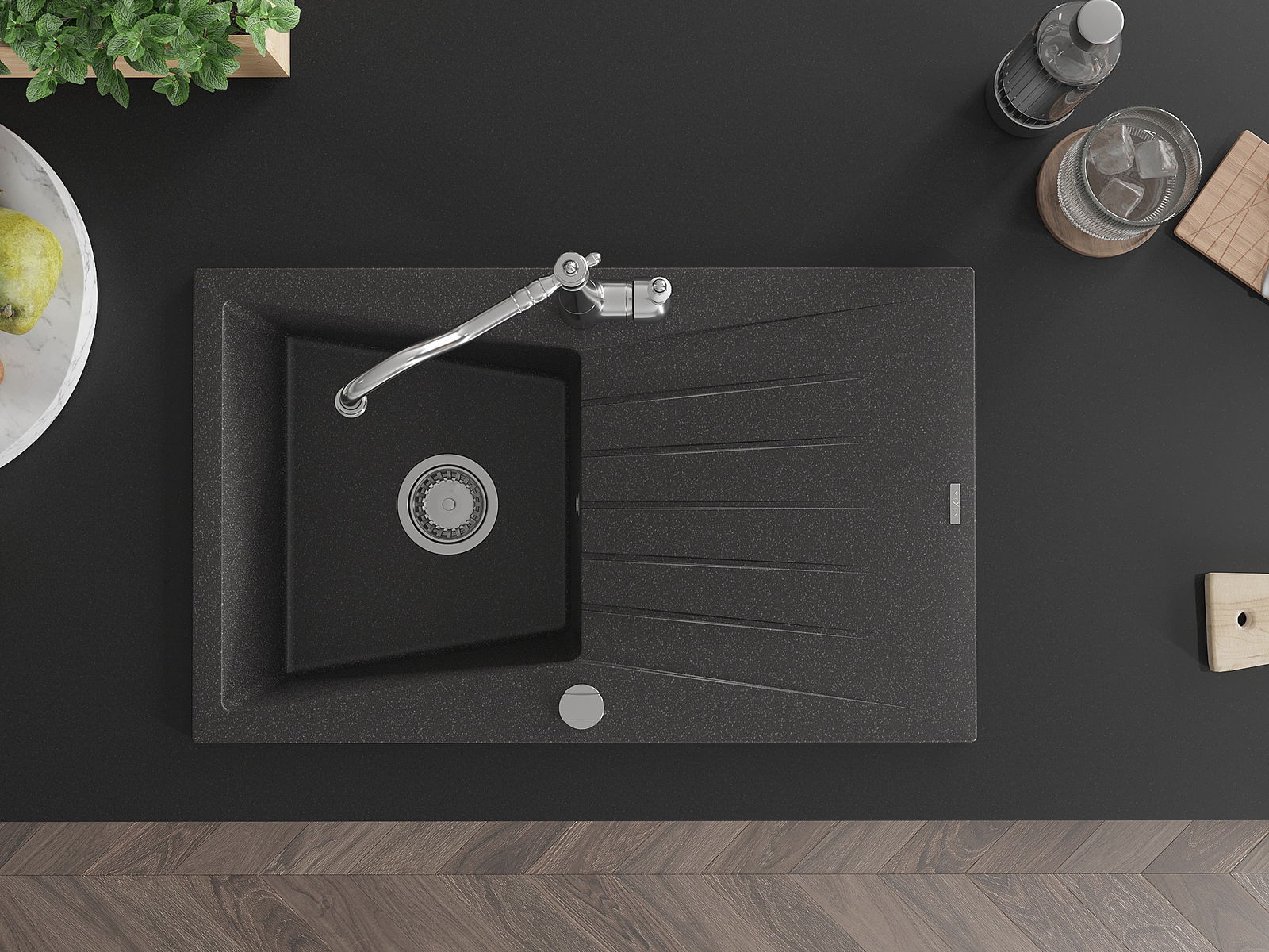 Mexen Cesar vienos sekcijos granito plautuvė su lašintuvu ir virtuviniu maišytuvu Carla, juodas taškuotas