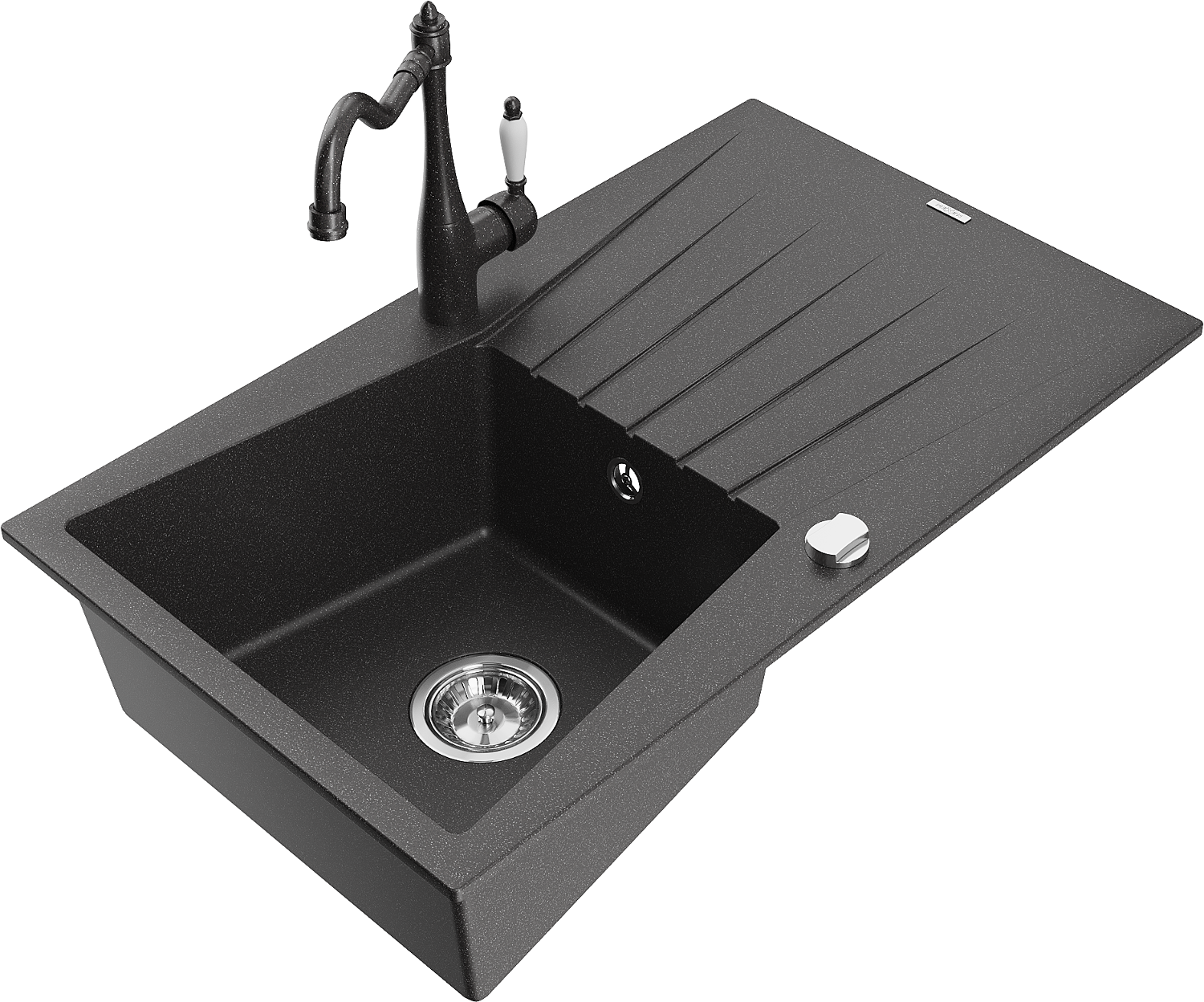 Mexen Cesar vienos kameros granitinė kriauklė su nutekėjimu ir virtuvės maišytuvu Carla, juodai dėmėtas