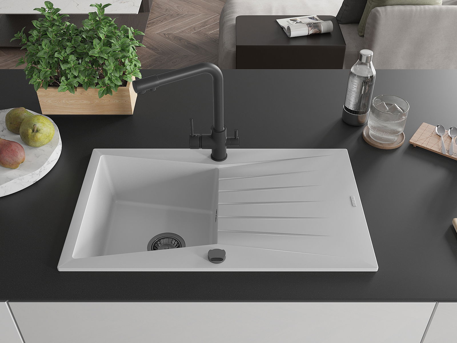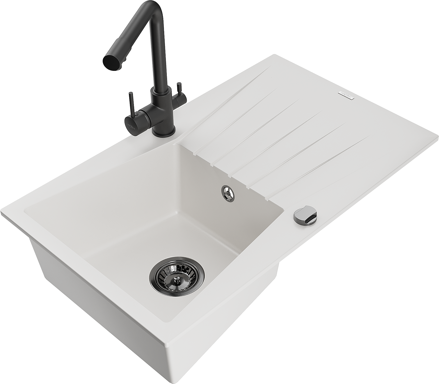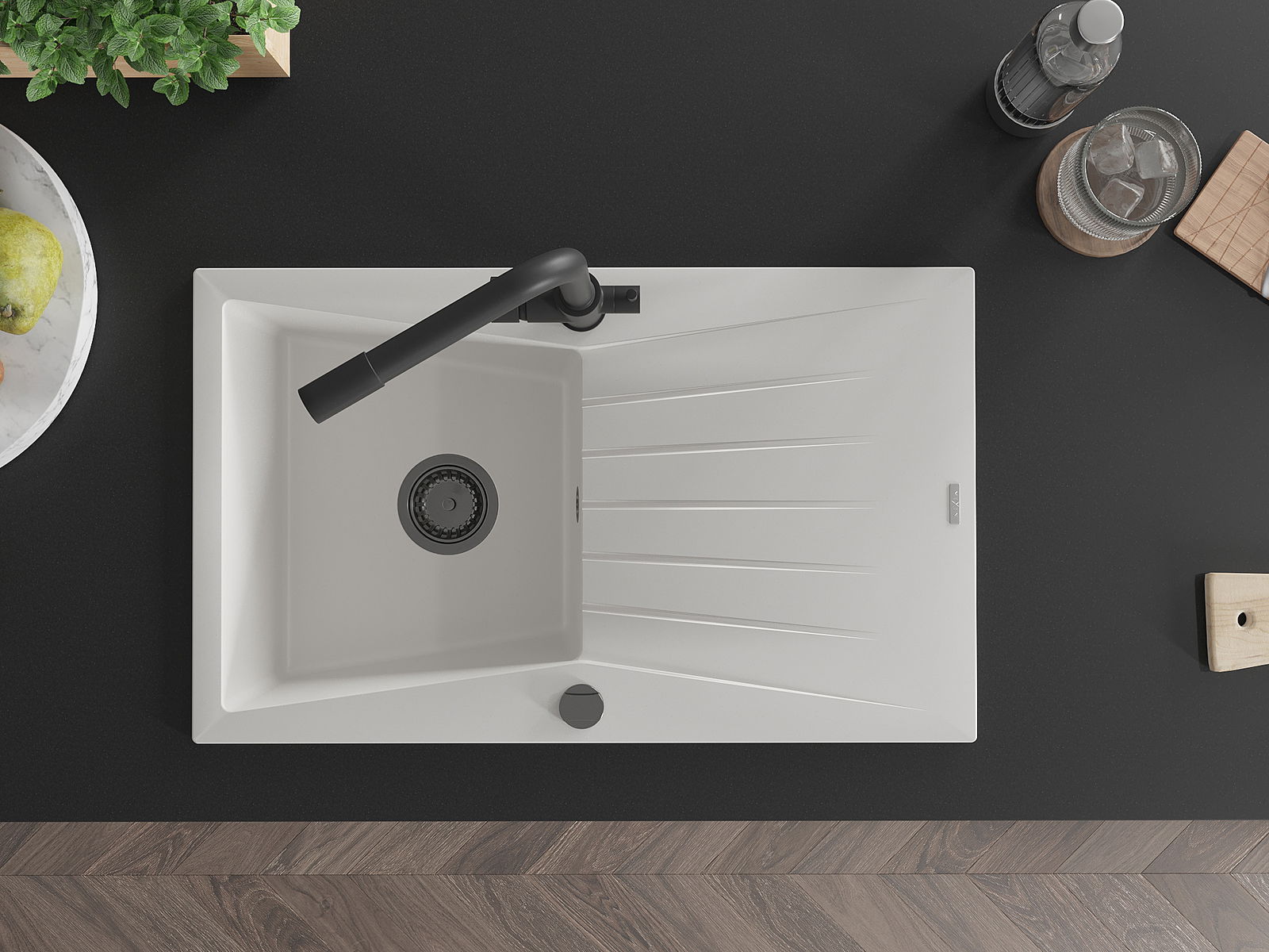 Mexen Cesar 1 skylių granito kriauklė su nutekėjimu ir virtuvės čiaupu Duero, balta - 6514-20-671600-70