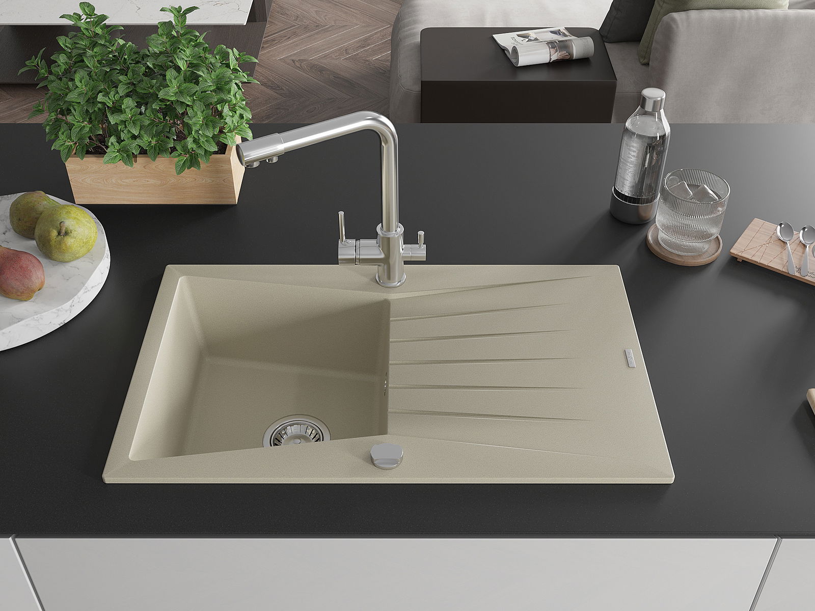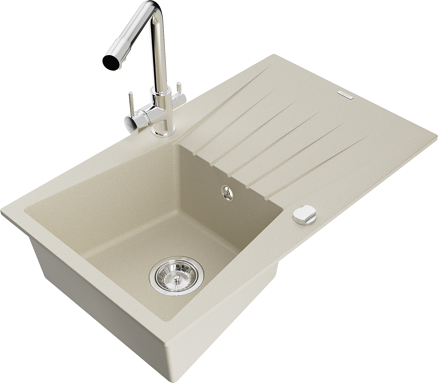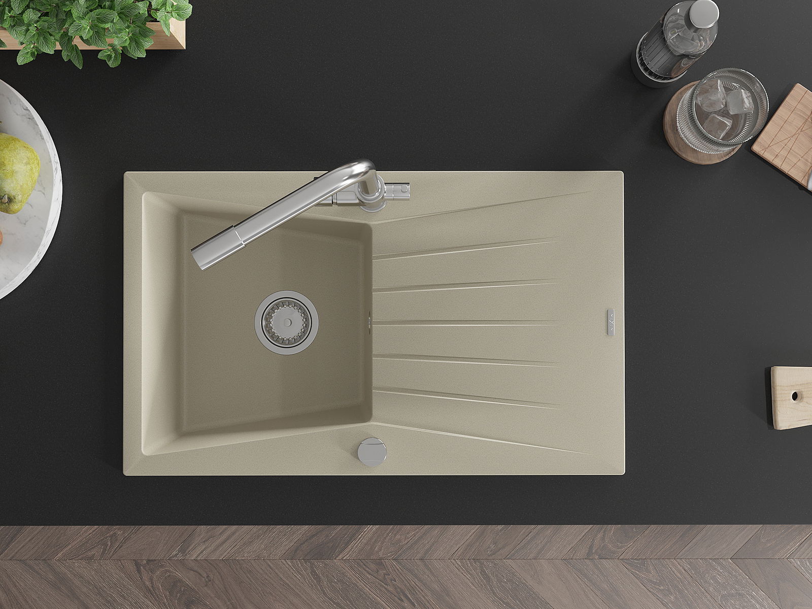 Mexen Cesar vienos kameros granitinė virtuvinė kriauklė su nutekėjimu ir virtuviniu maišytuvu Duero, smėlinė