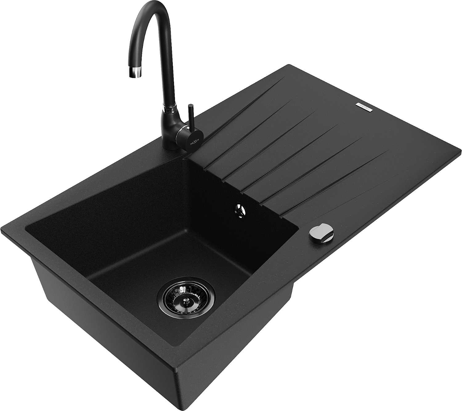 Mexen Cesar granitinė vienos kameros plautuvė su nusausintuvu ir virtuvės maišytuvu Telma, juodas - 6514-77-670200-70-B
