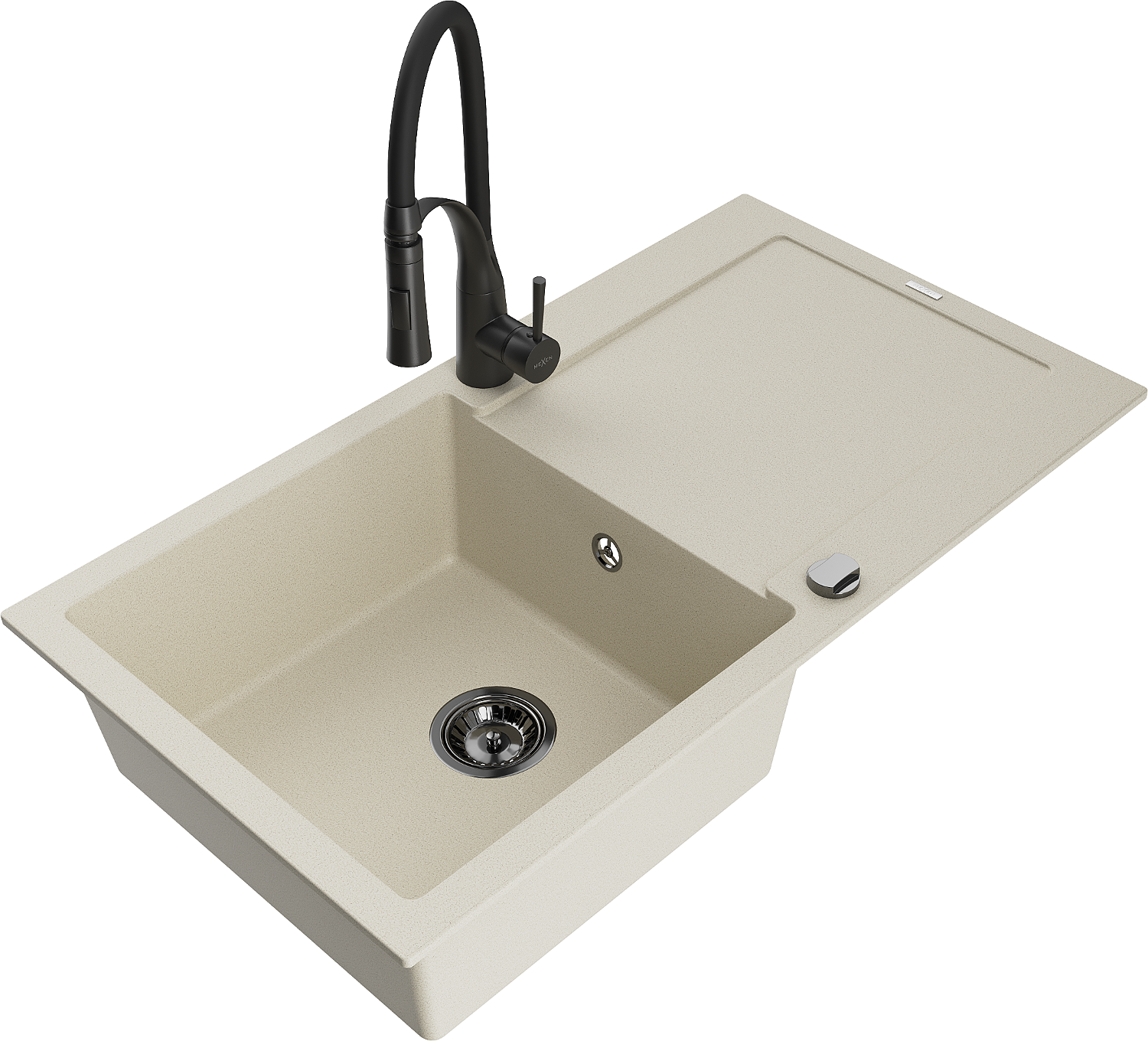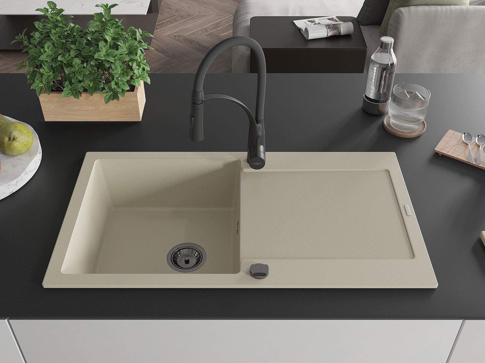 Mexen Leo granitinė vienos kameros kriauklė su nusausintuvu ir virtuviniu maišytuvu Aster, smėlio spalvos
