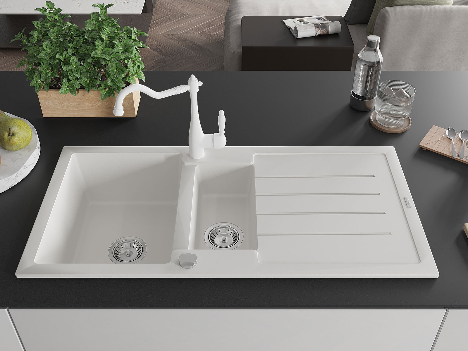 Mexen Andres granito plautuvė 1,5 skyrių su nusausintuvu ir virtuviniu maišytuvu Carla, balta - 6515-20-670700-20