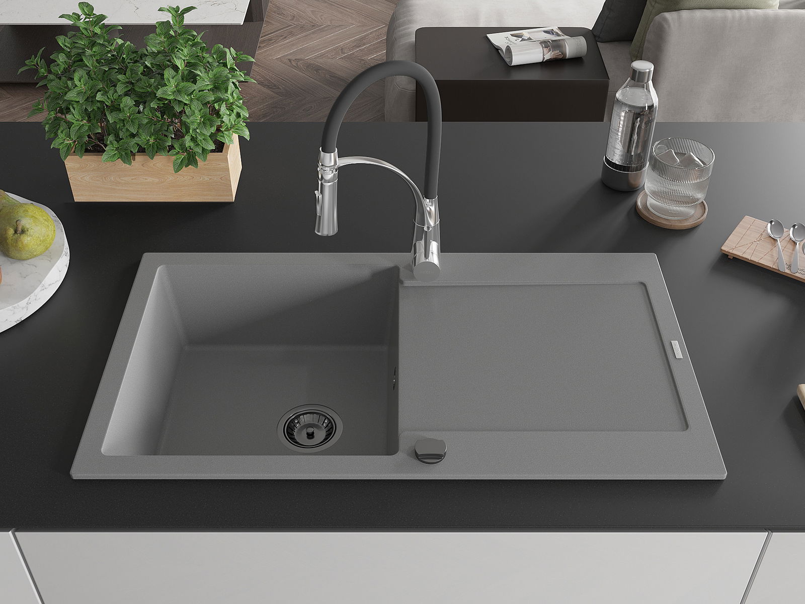 Mexen Leo granitinis vienos kameros plautuvė su nusausintuvu ir virtuvės maišytuvas Aster, pilka - 6501-71-73450-07-B