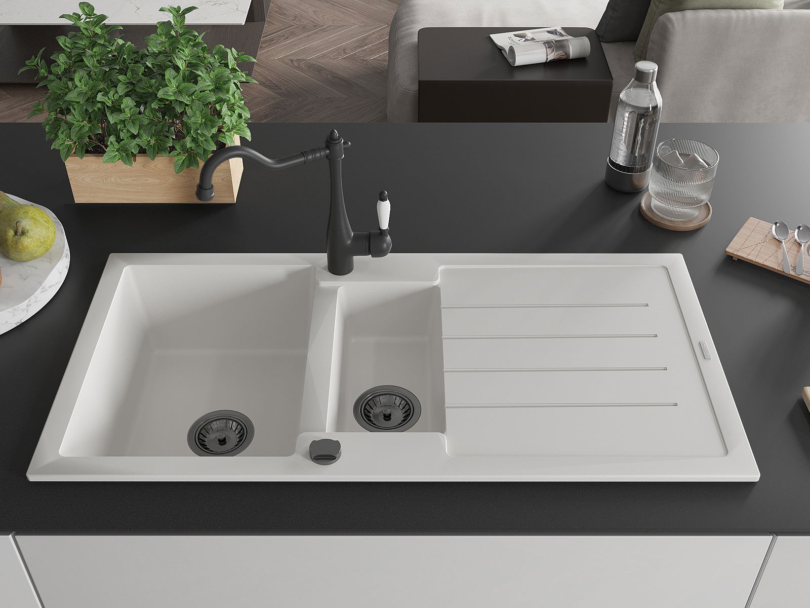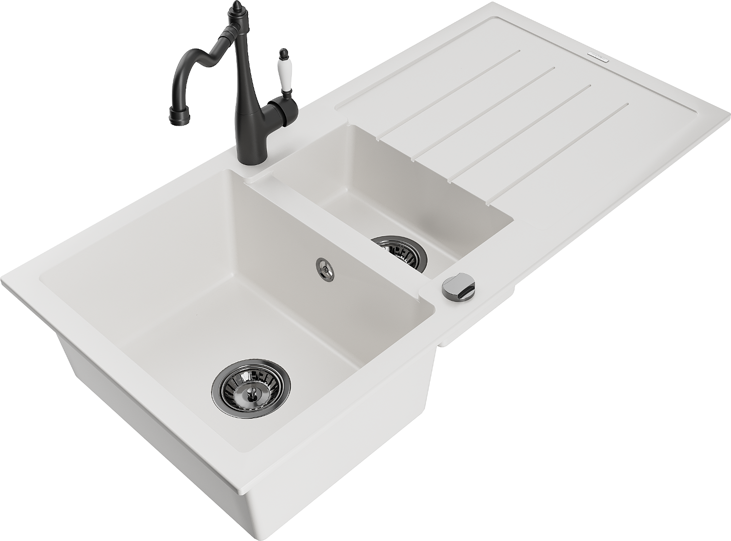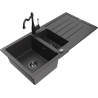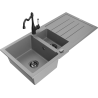 Mexen Andres granitinis kriauklė 1,5-komorinis su nutekėjimu ir virtuvės maišytuvu Carla, baltas - 6515-20-670700-70