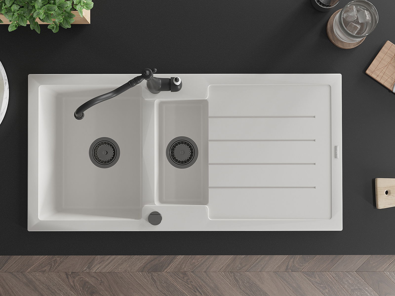Kriauklė turi 2 iš anksto frezuotas skyles, kurių skersmuo yra 35 mm, skirtas savarankiškam išmušimui. Jas galima naudoti, pavyzdžiui, skysčio dozatoriaus montavimui, kuris pašalins plastikinių butelių buvimą virtuvėje ir suteiks jai elegantišką apdailą.