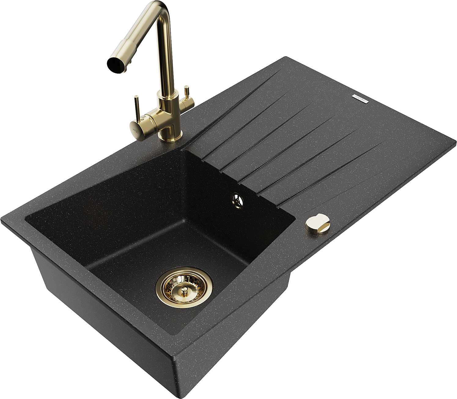 Mexen Cesar granitinė vienos kameros kriauklė su nusausintuvu ir virtuvine maišytuvu Duero, juoda/sidabrinė
