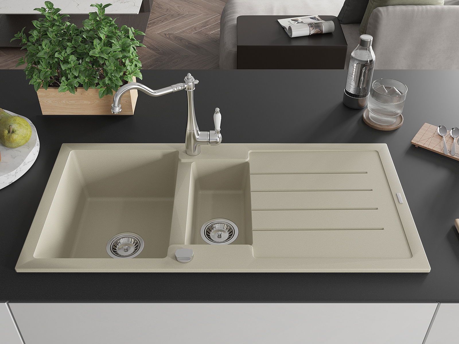 Mexen Andres granitinė kriauklė 1,5 kamerų su nusausintuvu ir virtuviniu maišytuvu Carla, smėlio spalvos - 6515-69-670700-00