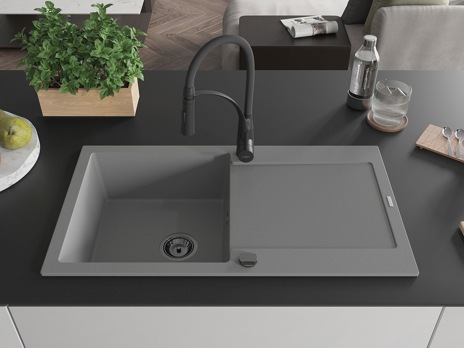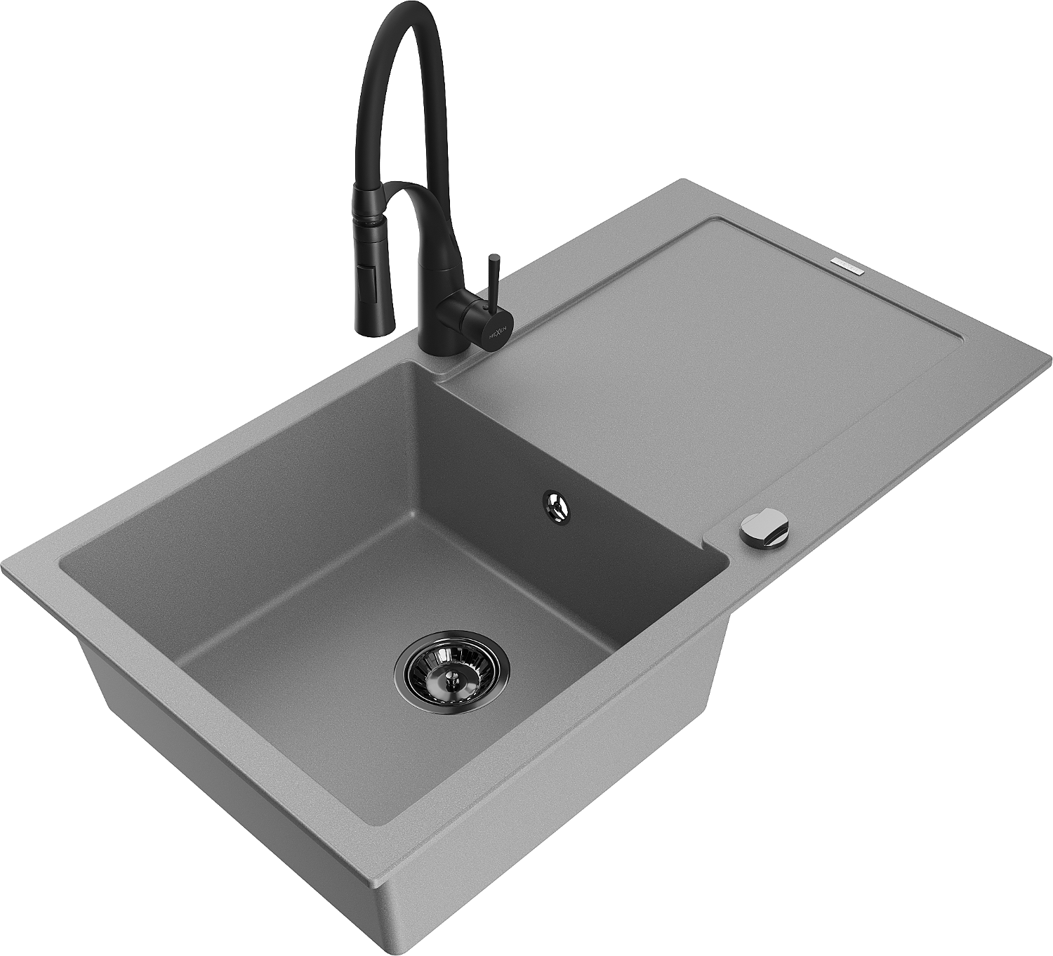 Mexen Leo granitinė vienos kameros kriauklė su nusausintuvu ir virtuvės maišytuvu Aster, pilka - 6501-71-73450-70-B