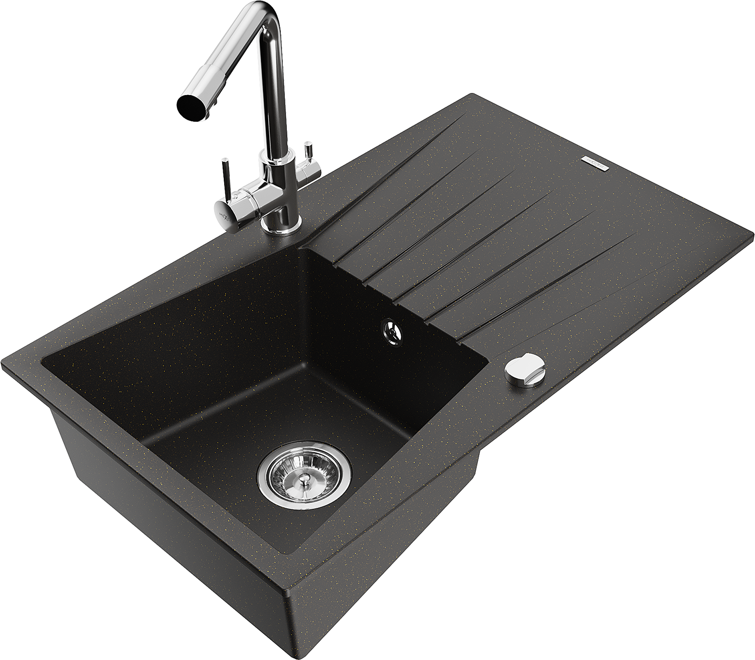 Mexen Cesar granitinė vienos spintelės kriauklė su nusausintuvu ir virtuvės maišytuvu Duero, juoda/auksinis metalikas