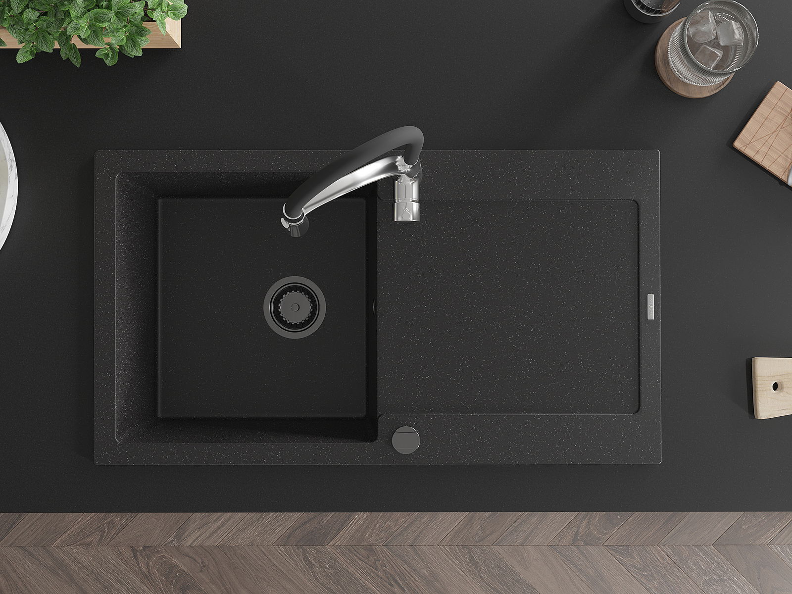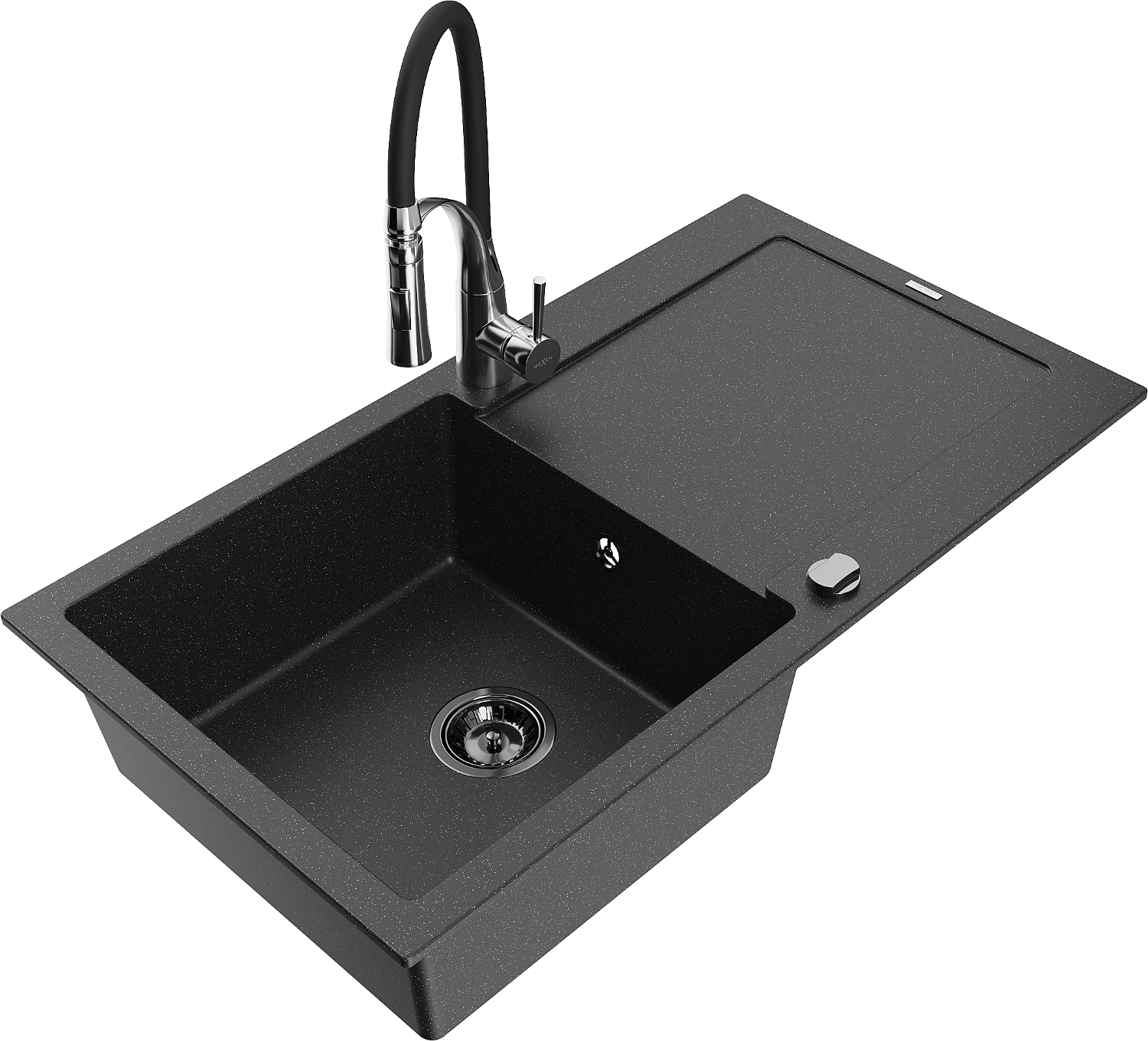 Mexen Leo granitinė vienos komoros plautuvė su nutekėjimu ir virtuvės maišytuvu Aster, juoda/sidabrinė metalinė
