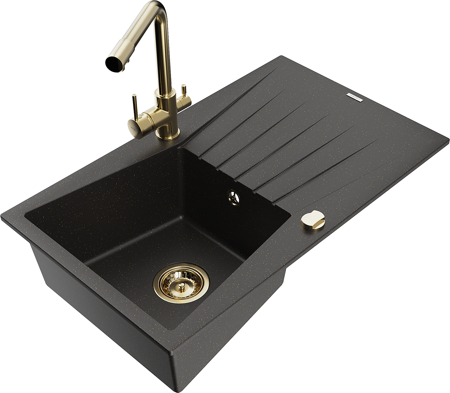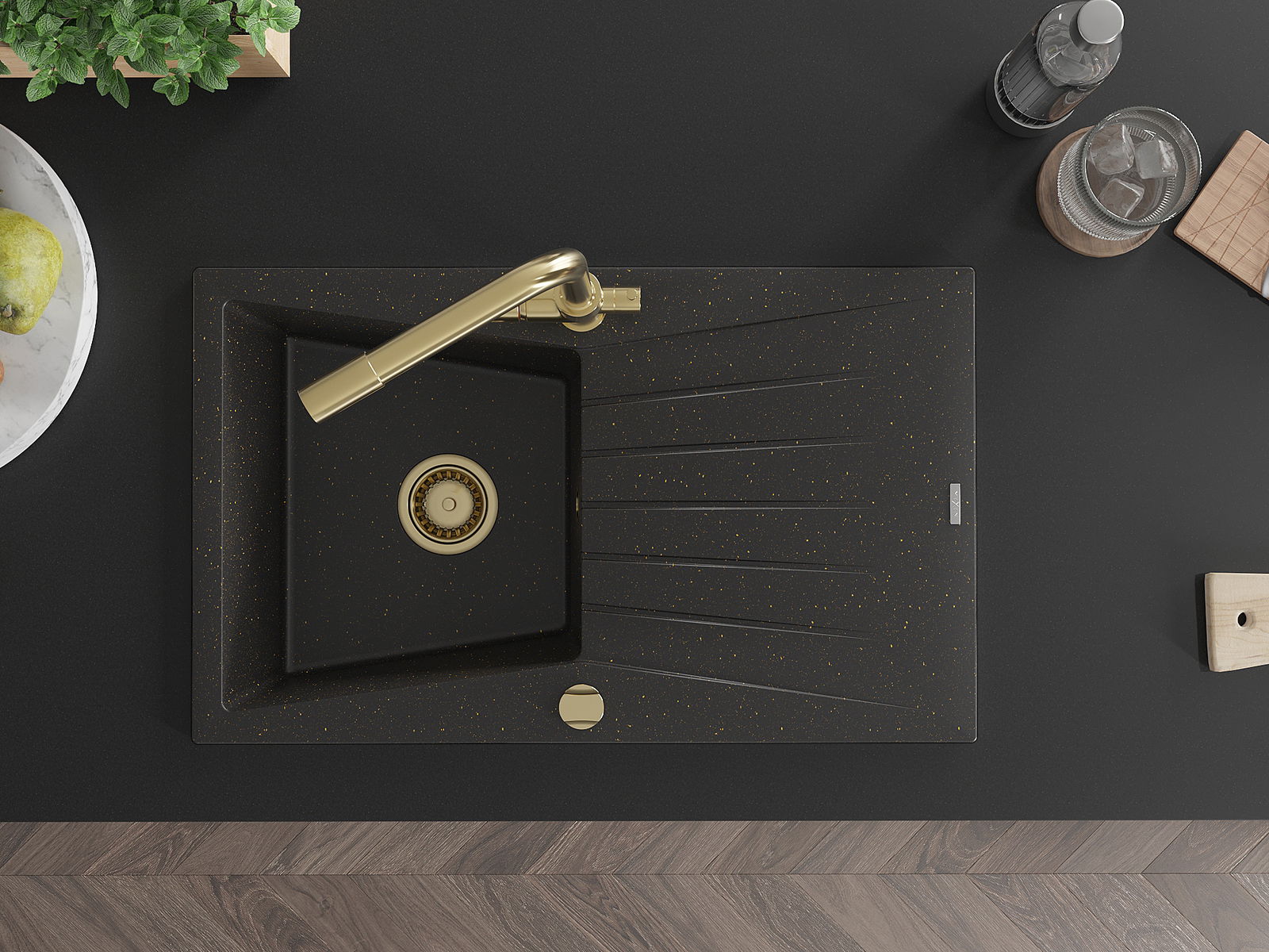 Mexen Cesar granitinis virtuvės kriauklė su viena kamera, su lašeliu ir virtuviniu maišytuvu Duero, juodas/auksinis