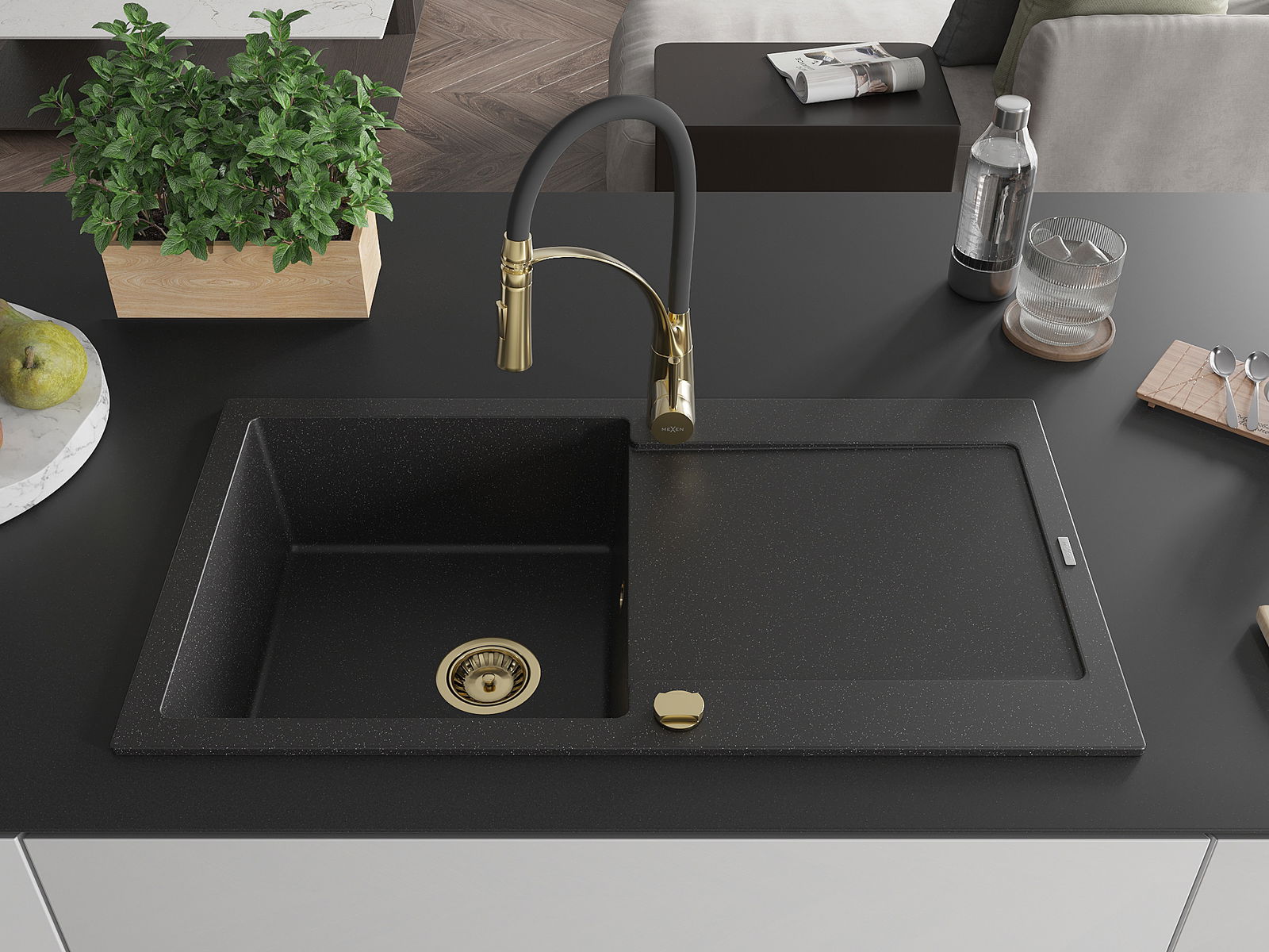 Mexen Leo granitinė plautuvė su 1 dubeniu, lašintuvu ir virtuviniu maišytuvu Aster, juoda/sidabrinis metalikas