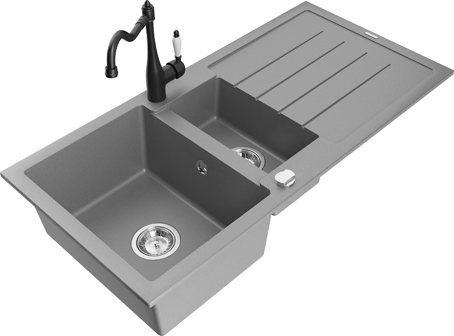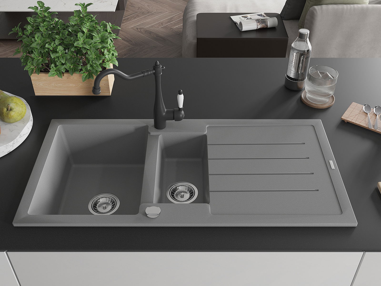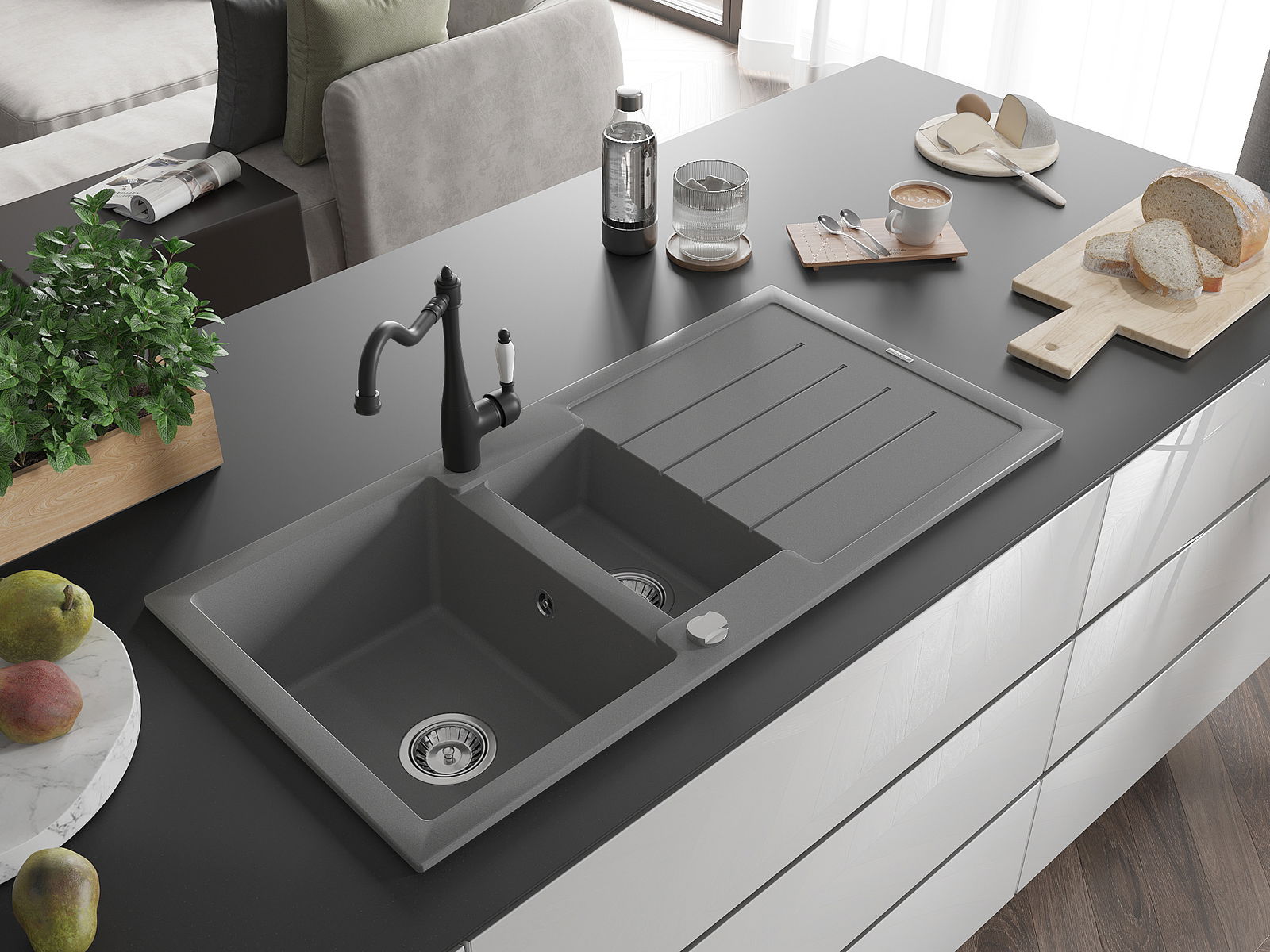 Mexen Andres granitinė 1,5 kamerų kriauklė su nutekėjimo padėklu ir virtuvine maišytuvu Carla, pilka - 6515-71-670700-70