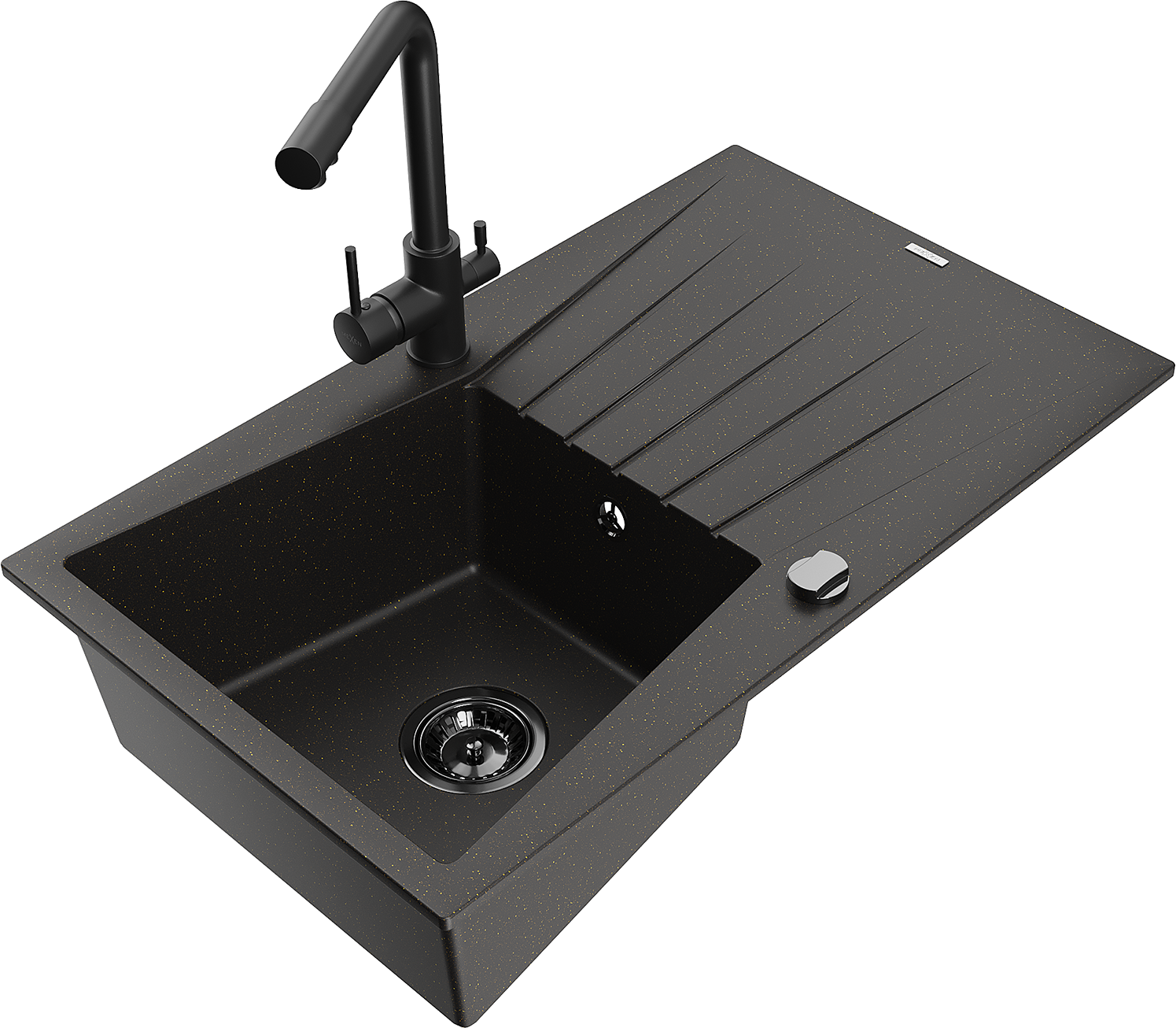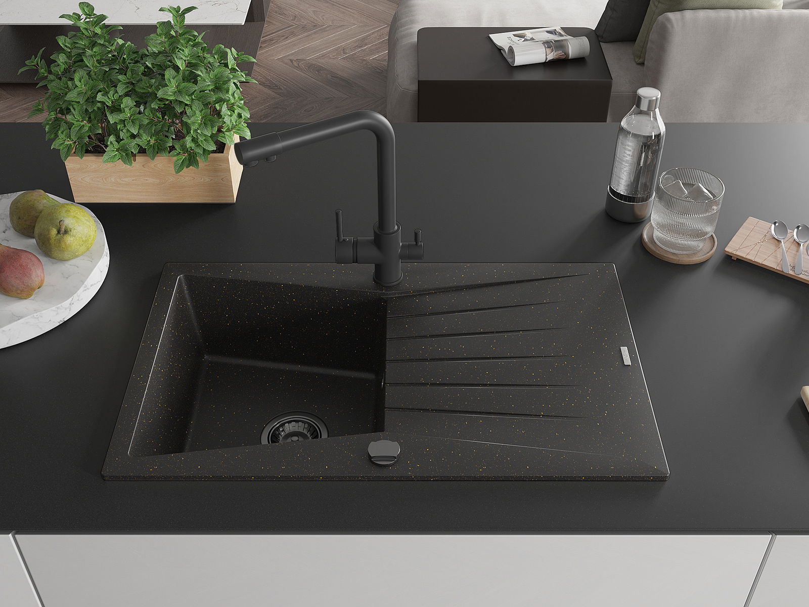 Mexen Cesar granitinė vienos kameros kriauklė su nusausintuvu ir virtuvės maišytuvu Duero, juoda/auksinė metalo spalva